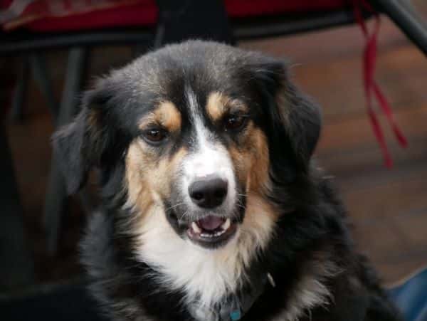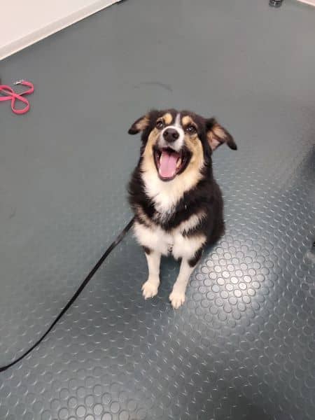 - tricolor schwarz weiß braun, sehr flauschiges Fell, die fedrige Rute gerade getragen