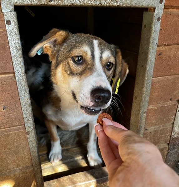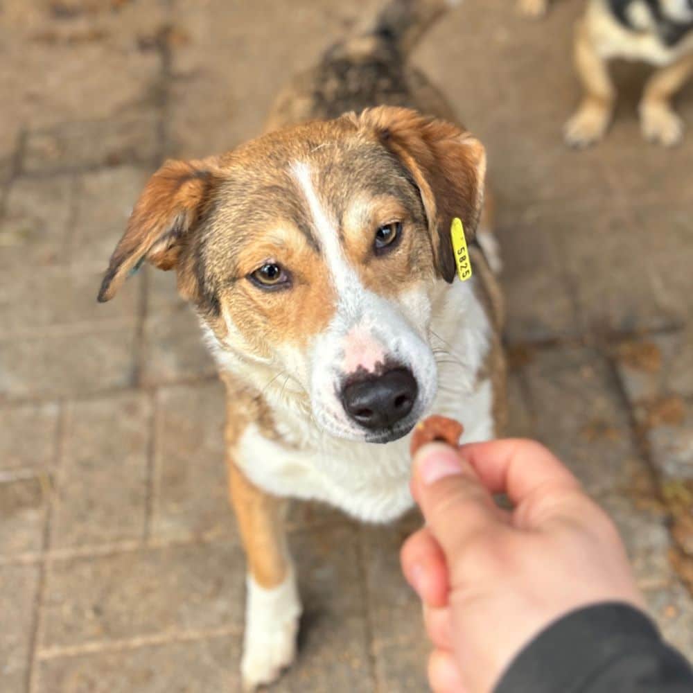 MARLI’s holt sich vorsichtig Futter aus der Hand, zieht sich aber direkt wieder zurück. Er ist sehr neugierig, aber unsicher, wie er sich verhalten soll.