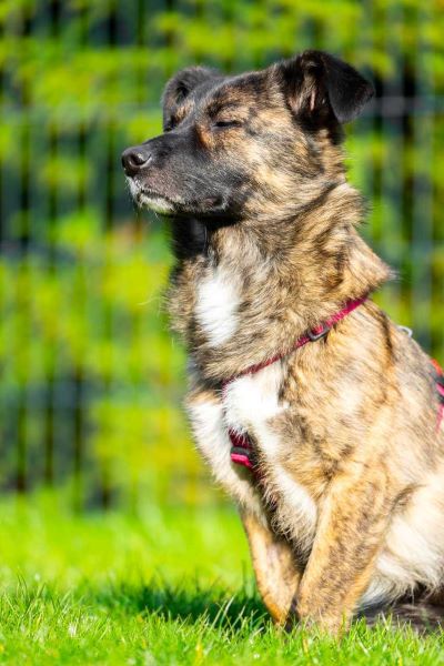 Beim Spazieren lässt sie sich sehr gut an der Leine führen und zeigt keine Angst. Auf fremde Hunde reagiert sie manchmal etwas skeptisch und möchte dies durch zaghaftes Bellen ausdrücken, lässt sich dann aber sehr gut korrigieren. Sie zeigt einen leichten Jagdtrieb, die Verträglichkeit mit Katzen konnte auf der Pflegestelle nicht getestet werden. Kindern gegenüber ist sie sehr aufgeschlossen, zeigt sich neugierig und freut sich über Aufmerksamkeit.
