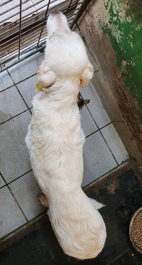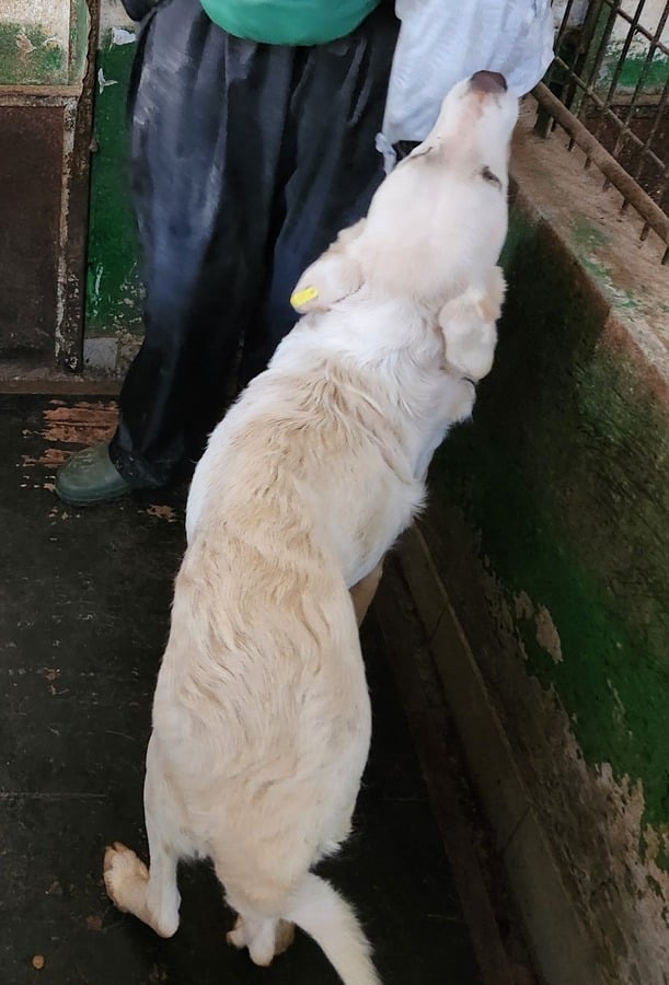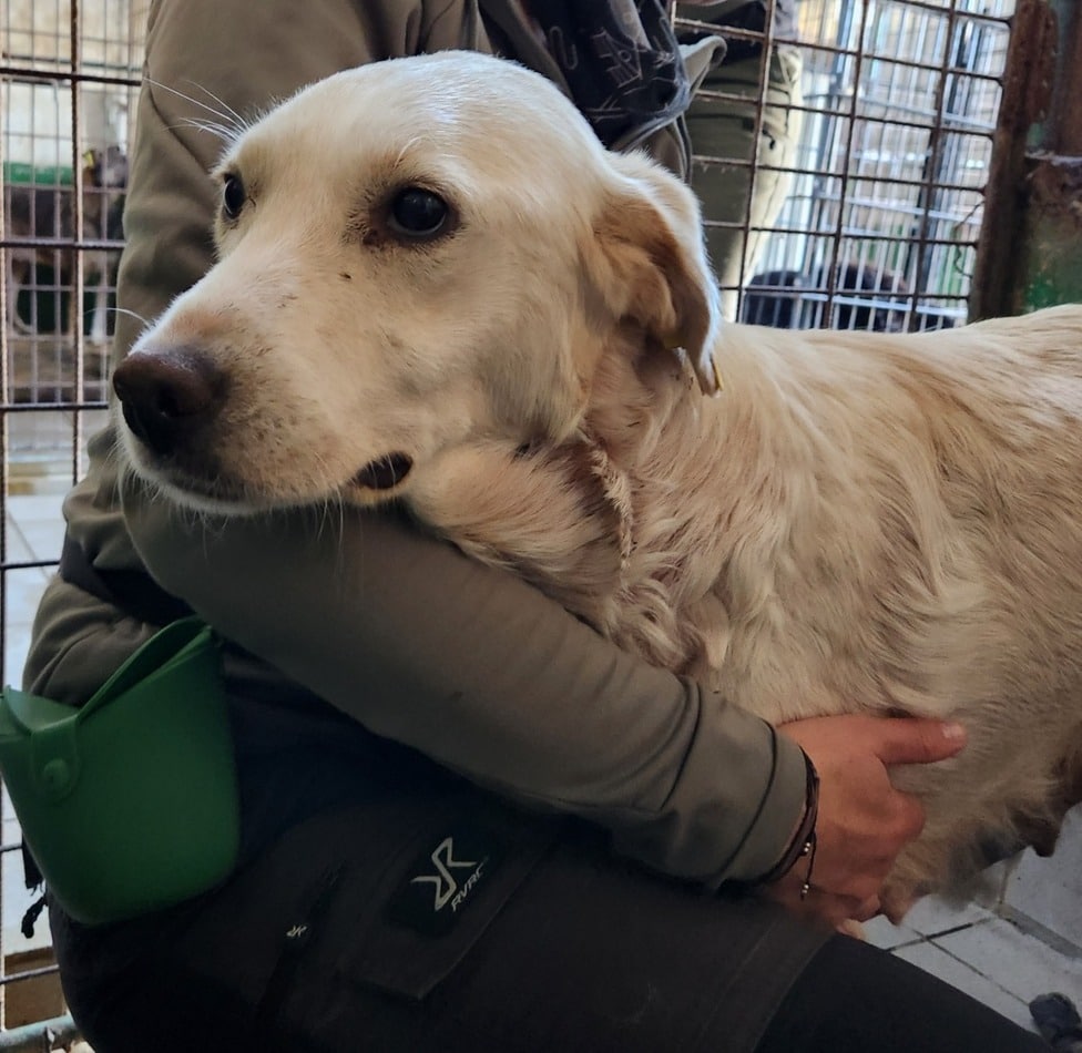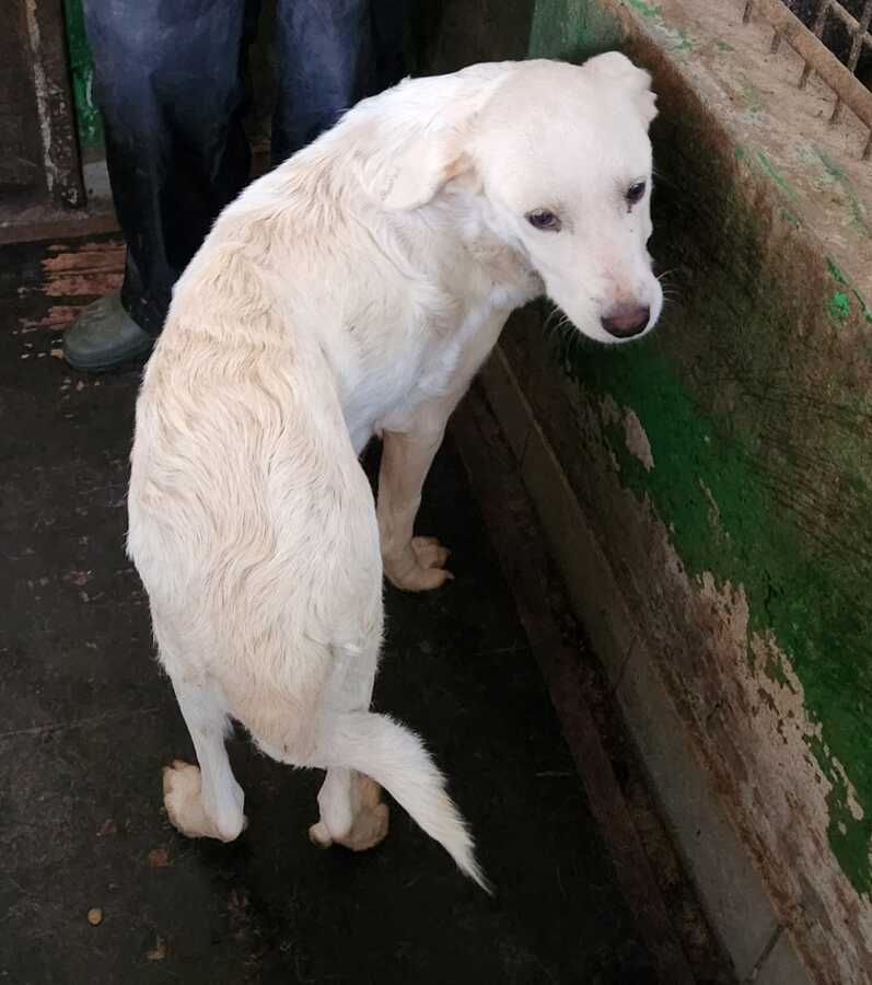 Beim Anblick der viel zu dünnen MELODIE schnürte es uns das Herz zu. Sie zeigte sich ganz ruhig, besonnen und schmiegte sich eng an uns. Die Streicheleinheiten sog sie förmlich auf, die angebotenen Leckerchen nahm sie dankbar aus der Hand. Ihr ausgeprägtes Gesäuge lässt darauf schließen, dass MELODIE vor kurzem Welpen hatte, diese aber nicht mehr bei ihr waren. Das erklärt auch ihren traurigen Ausdruck in den Augen.