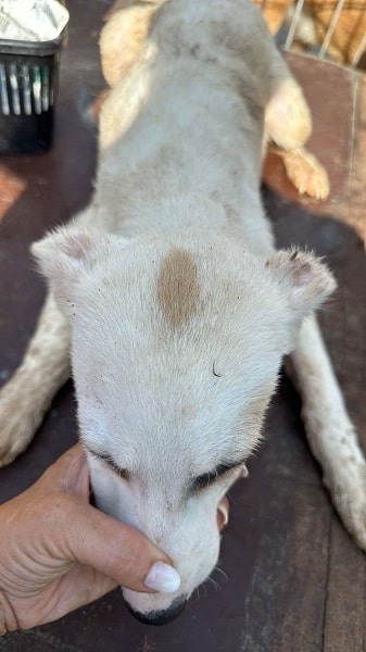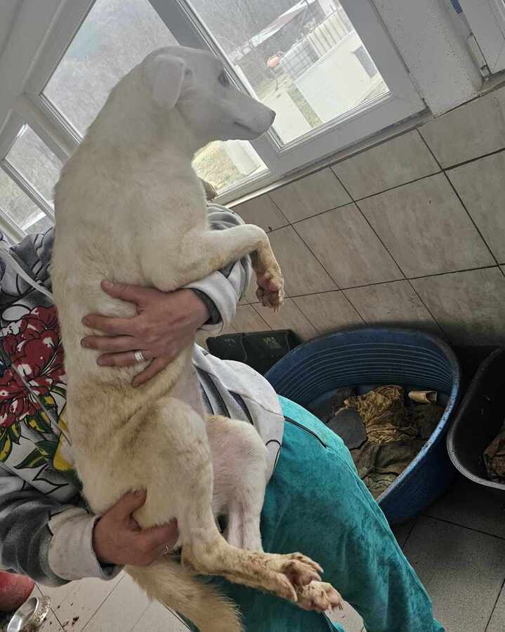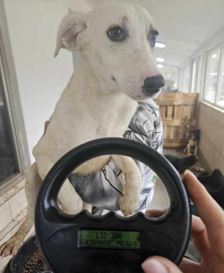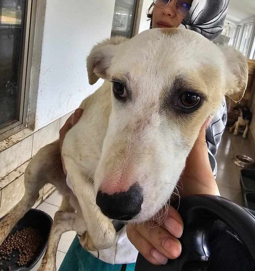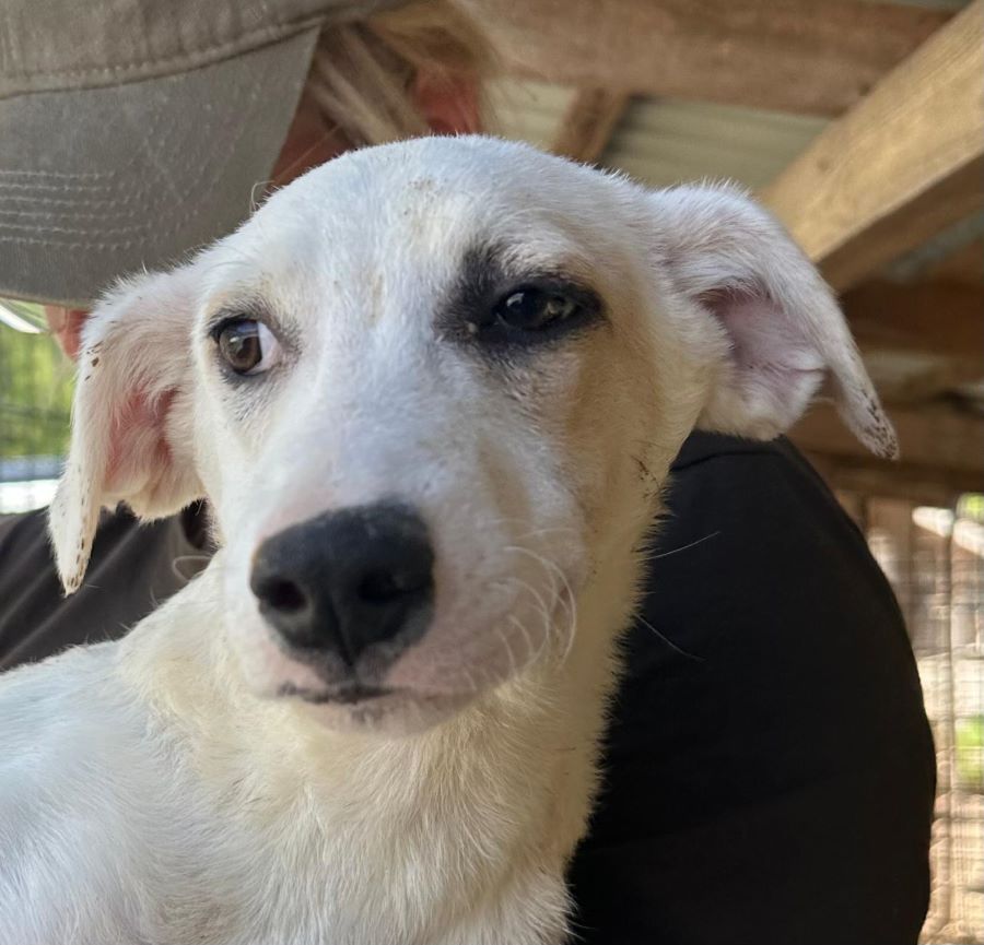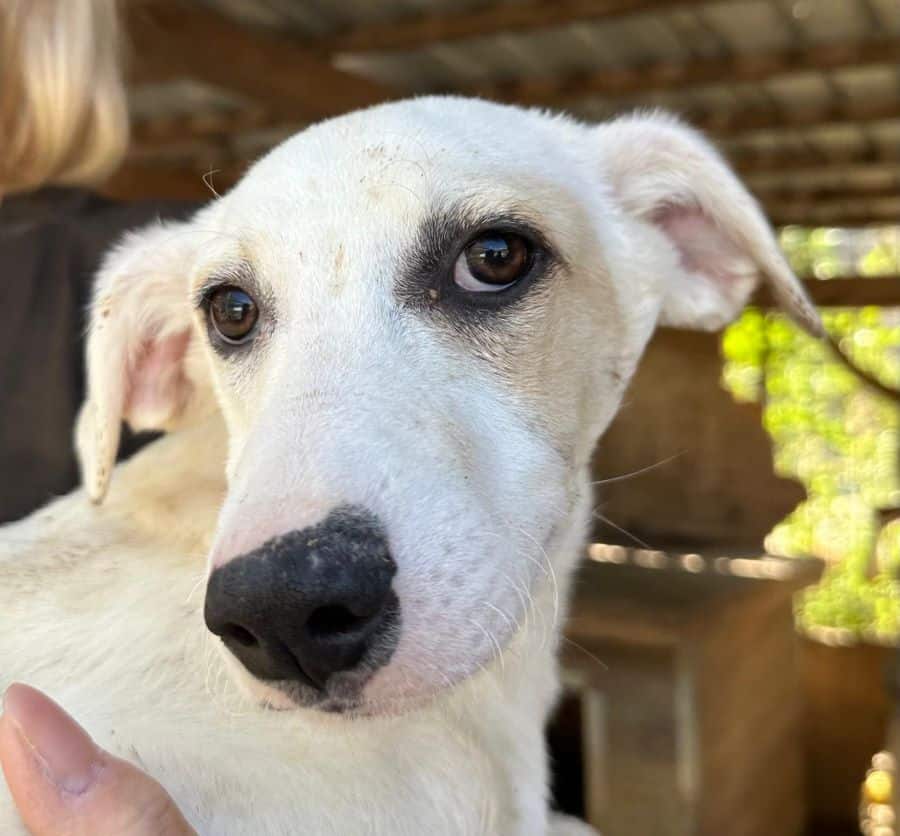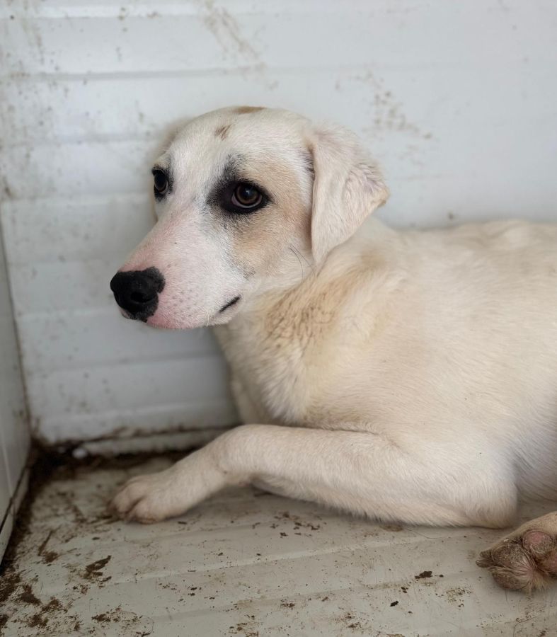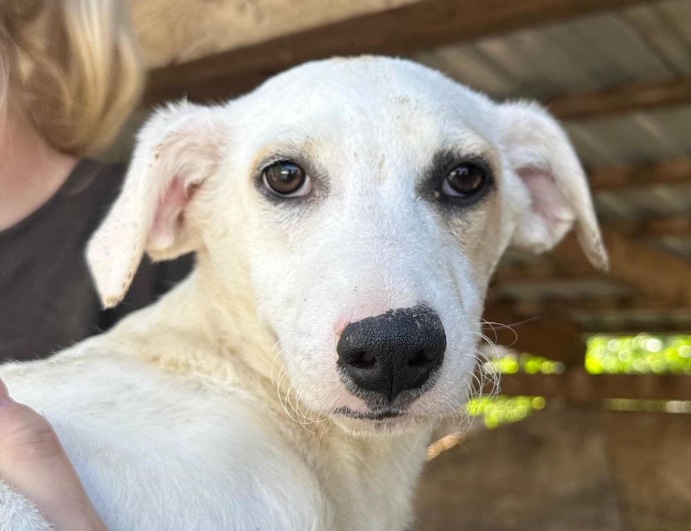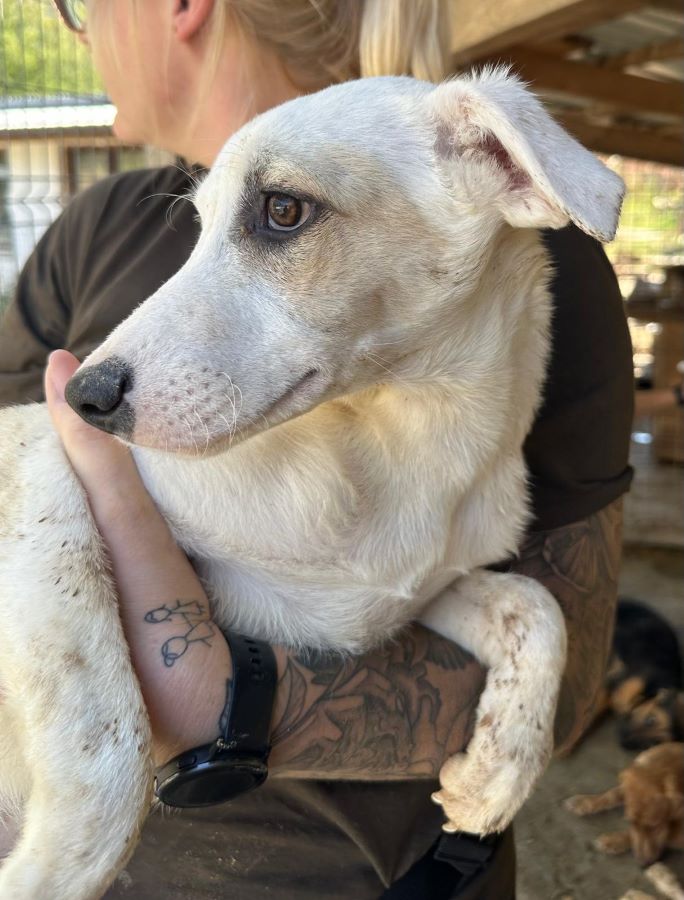 Bei unserem Besuch lag MELVA ausschließlich in ihrer Hütte und zitterte stark, als wir uns ihr zuwandten. Auch wenn sie sich noch nicht aktiv dem Menschen nähert, lässt sie sich unter vorsichtiger Annäherung anfassen, ohne Abwehrverhalten zu zeigen. MELVA kennt das Leben und die Nähe mit Menschen nicht und braucht dringend einen sicheren Ort, an dem sie in ihrem Tempo ankommen darf. Mit anderen Hunden ist sie gut verträglich, ein souveräner Ersthund könnte ihr beim Start ins neue Leben helfen.