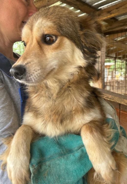 Wir besuchten die kleine Hündin nach 4 Wochen erneut. Zunächst lag sie in ihrer Hütte und wir berührten sie dort eine Weile mit dem Handschuh. Dies ließ sie erst zu, zeigte dann aber plötzlich ein kurzes Abschnappen, ohne den Handschuh zu berühren. Davon haben wir uns jedoch nicht beeindrucken lassen und konnten sie nach kurzer Zeit sogar auch ohne Handschuh streicheln. Später nahm sie ihren Mut zusammen und kam schwanzwedelnd aus der Hütte, um die Leckerlies abzustauben. Dabei konnten wir sie leicht an der Nase berühren. Sie sitzt mit mehreren Junghunden unterschiedlichen Geschlechts in einem kleinen Kennel und ist dort grundsätzlich verträglich. Wir konnten beobachten, wie sie einen jungen, etwas unsicheren Rüden durch klare Kommunikation auf Abstand hielt. In einer ruhigeren Umgebung wird sie sicherlich schnell auftauen.