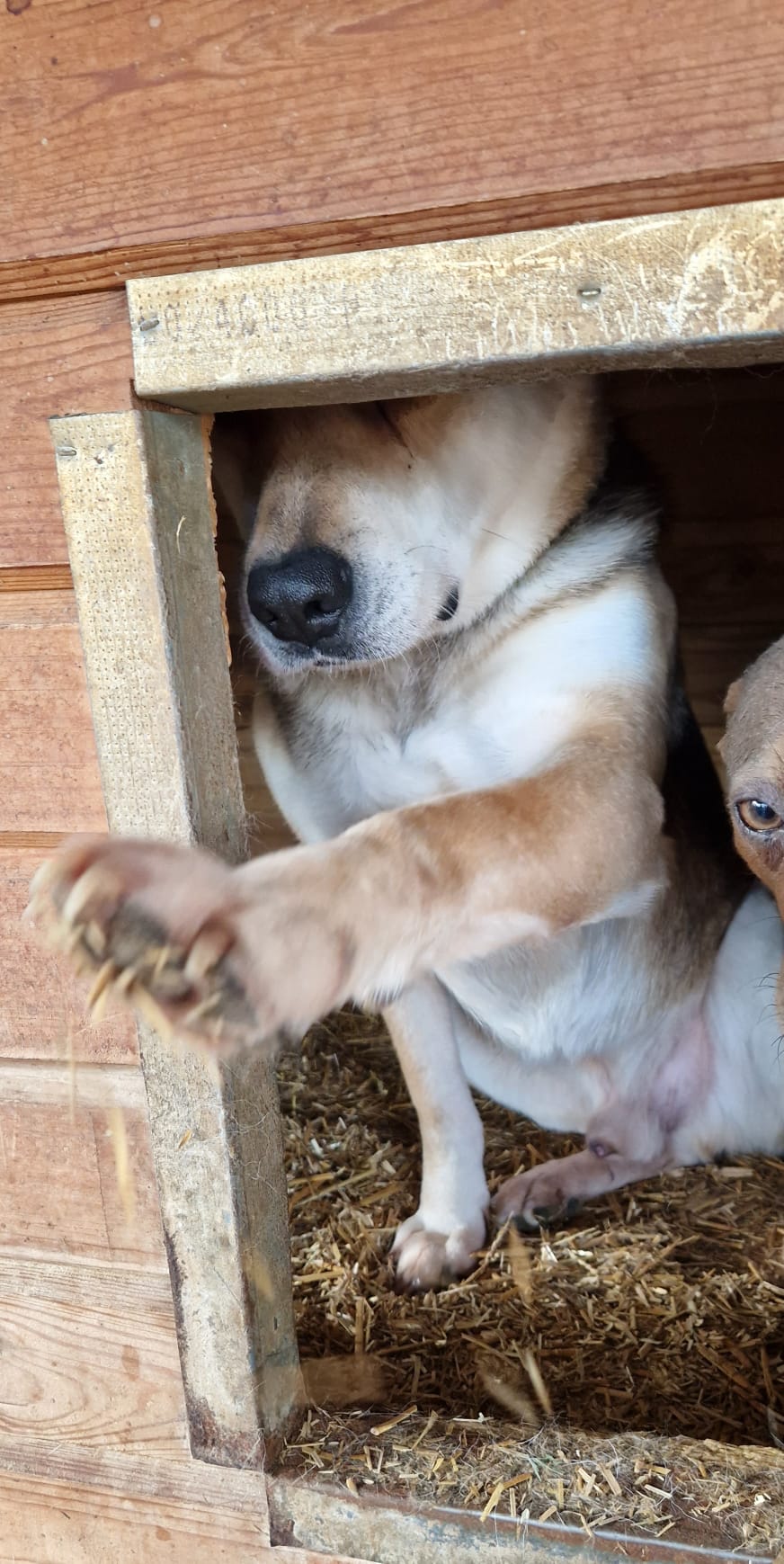 Ein freundlicher etwas schüchterner Rüde, für den es nicht einfach wird, aber MICKY leidet dort unter den Umständen und scheinbar in der Hütte sitzt, um keinen Ärger mit anderen Hunden zu bekommen. Wir konnten ihn nur in der Hütte beobachten, mit den beiden Hündinnen, mit denen er sich eine Hütte teilt, zeigte MICKY sich sehr verträglich.