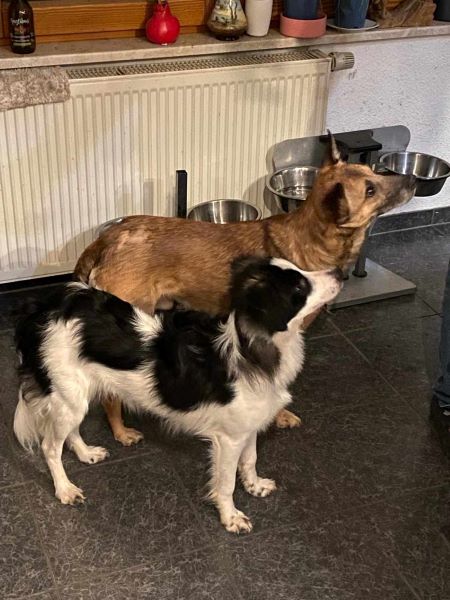Mit den Hunden im Rudel komme ich bestens klar. Ich bin eigentlich schon der „Chef“, obwohl die anderen Hunde das noch gar nicht wissen. Fremden Hunden begegne ich noch mit Misstrauen und Ängstlichkeit, wobei ich da aktuell noch Angriff für die beste Verteidigung halte, was sich in lautstarkem Bellen äußert.
