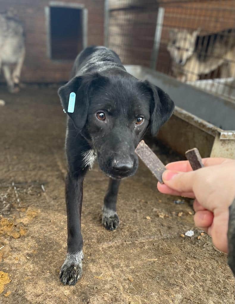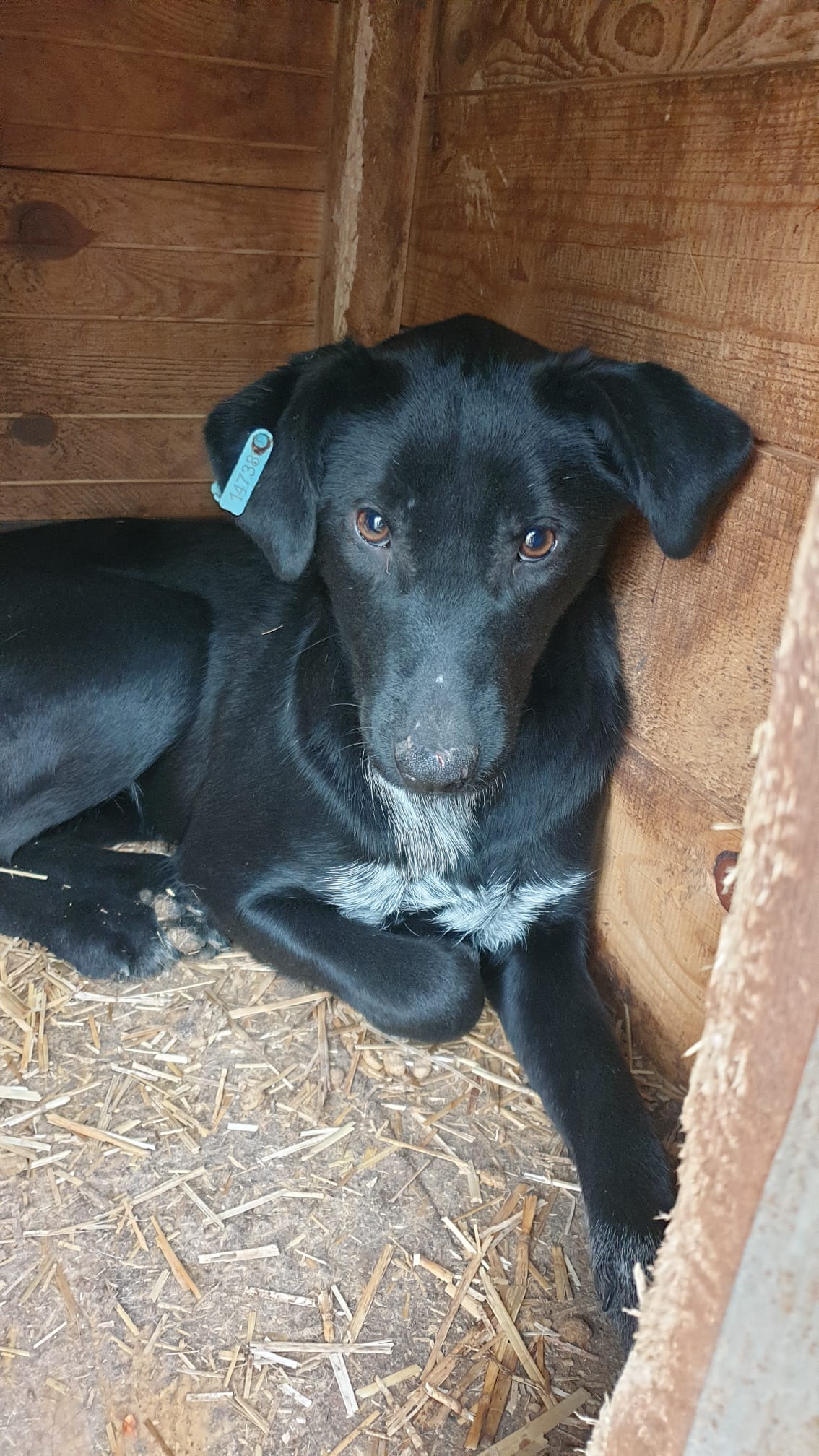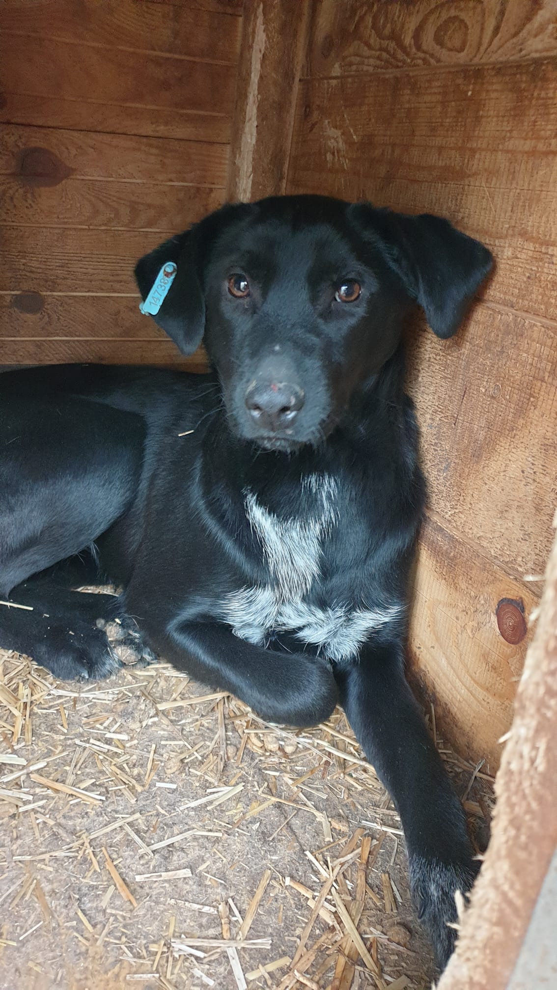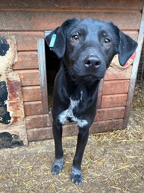 MIENA zeigte sich bei unserem Besuch interessiert und traute sich nach ein paar Minuten auch aus ihrer Hütte. Sie nahm Leckerlis aus der Hand, aber für mehr fehlte ihr der Mut. Die schüchterne Hündin orientiert sich stark an ihren Artgenossen, daher sollte sie Zweithund werden.