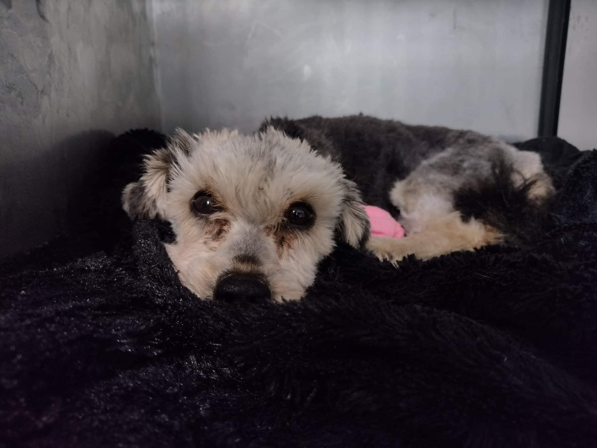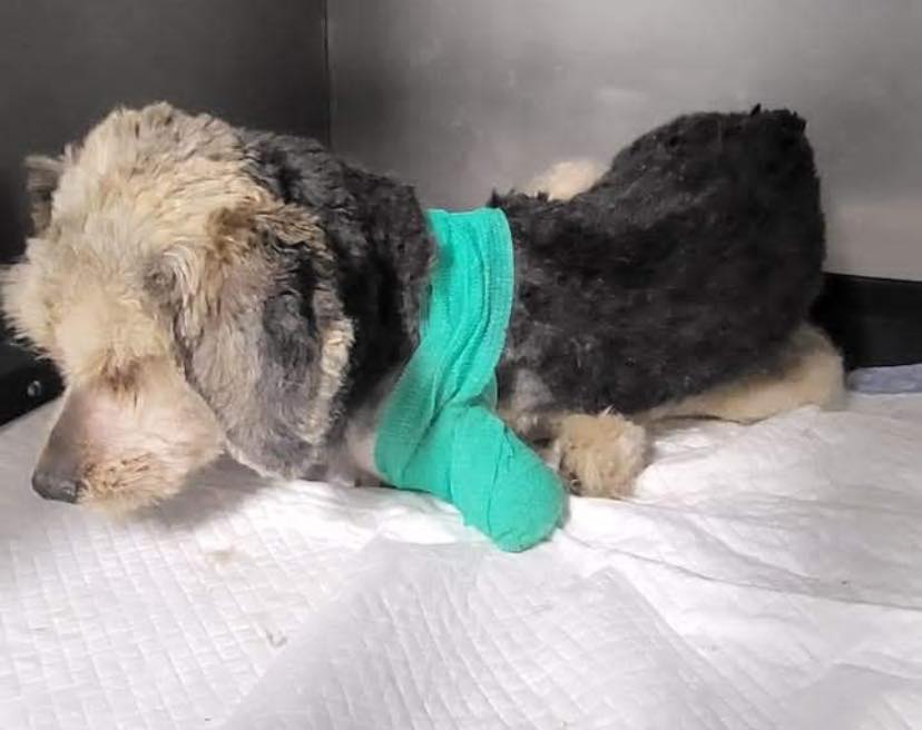 MIKAA wurde völlig verwahrlost und mit zerstörten Vorderläufen gefunden. Ein Zug hatte sie erfasst, so dass die Vorderläufe in der Klinik amputiert werden mussten.