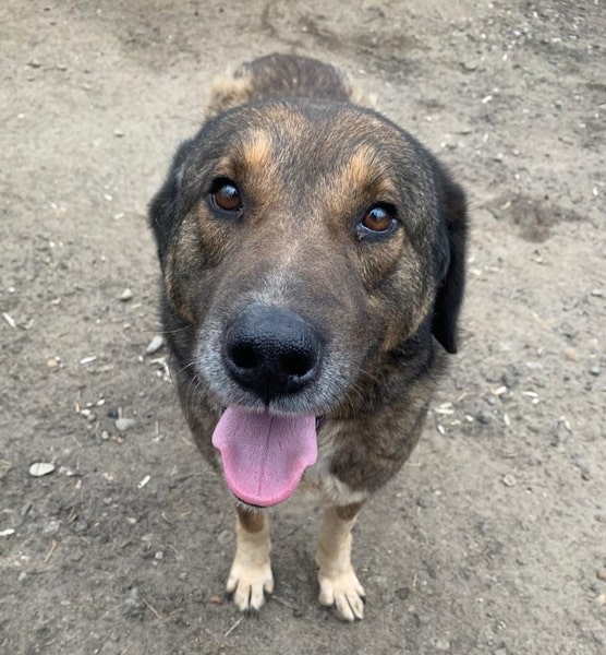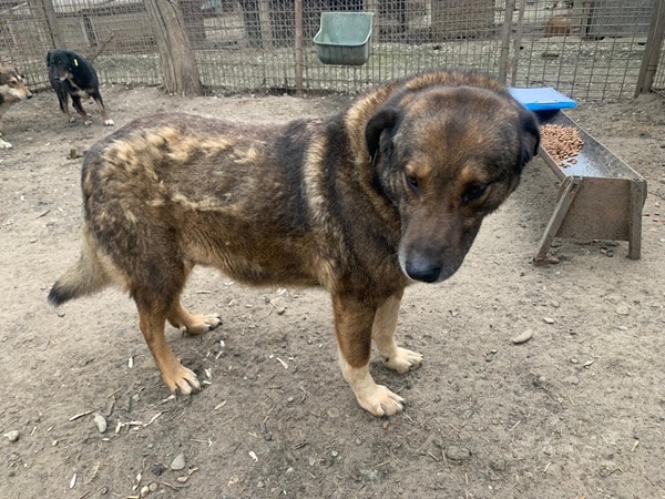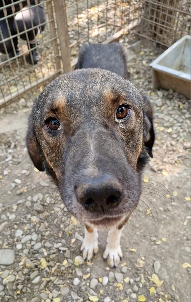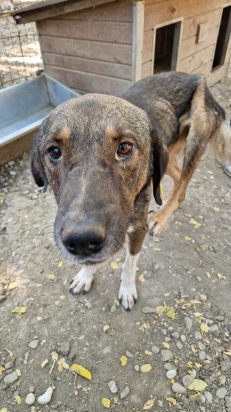 MIKESCH kam sofort aus seiner Hütte, als wir den Kennel betraten. Er ist leider viel zu dünn und trank dann auch erst einmal ausgiebig Wasser. Wir konnten nichts Auffälliges feststellen, auch nicht, dass er gemobbt wird. Er sitzt mit mehreren unsicheren Hunden zusammen, keiner hatte Verletzungen, sodass wir davon ausgehen, dass MIKESCH verträglich ist. Auch als ein anderer präsenter Rüde in seine Nähe kam, konnte man nichts Auffälliges sehen. Zu uns war MIKESCH durchweg freundlich, neugierig, offen und zutraulich und ließ sich gut streicheln.