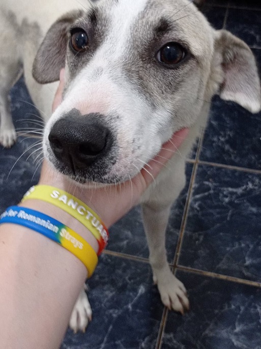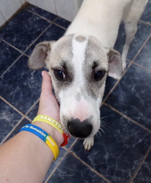 Die junge Hündin ist absolut freundlich, geht aufgeschlossen auf Menschen zu und freut sich über Zuwendungen. Nachdem sie endlich wieder Bewegungsfreiheit hat, wackelt sie tapfer durch die Gegend und genießt dies sehr. Anderen Hunden begegnet sie ebenfalls sehr nett.