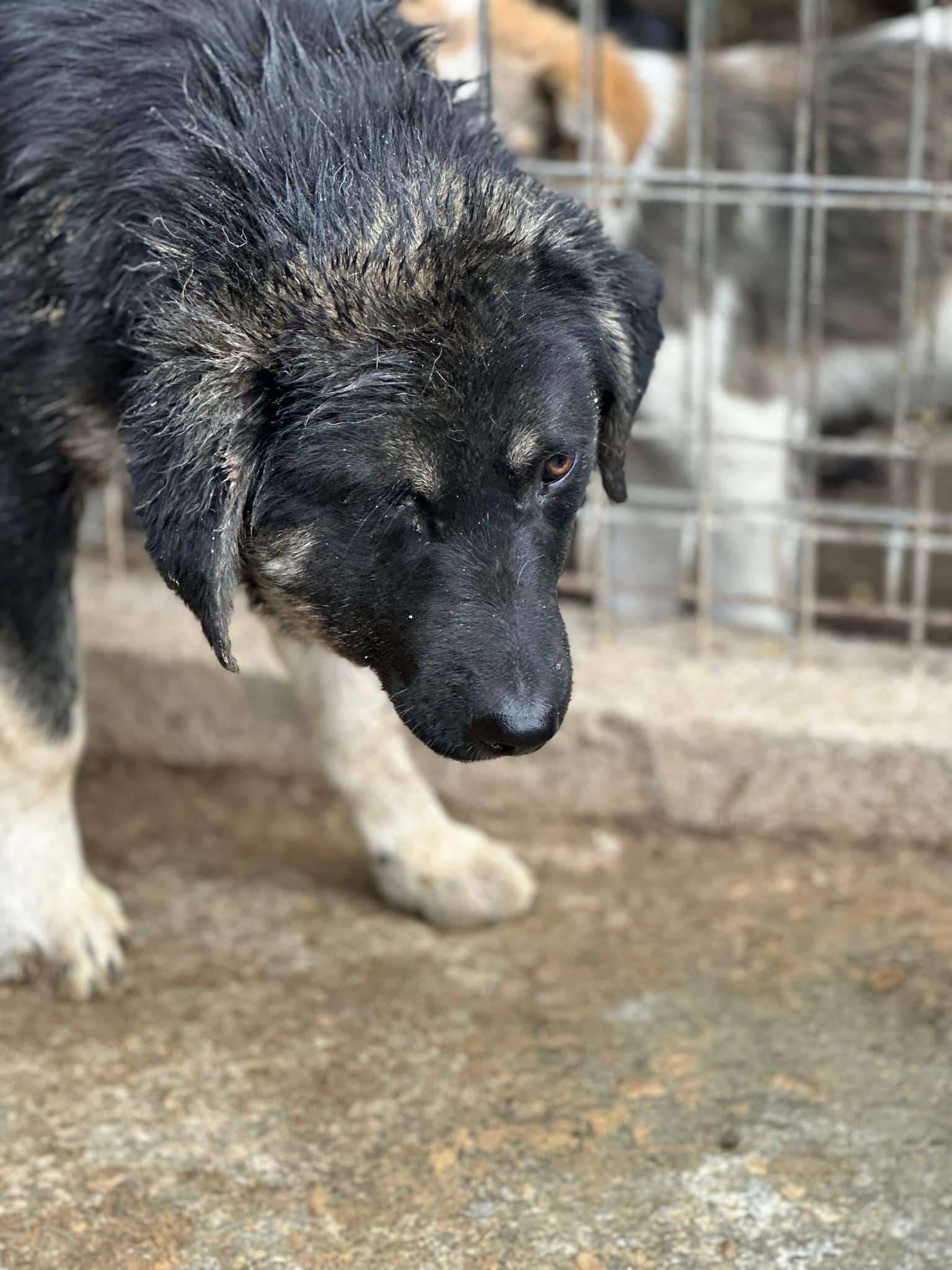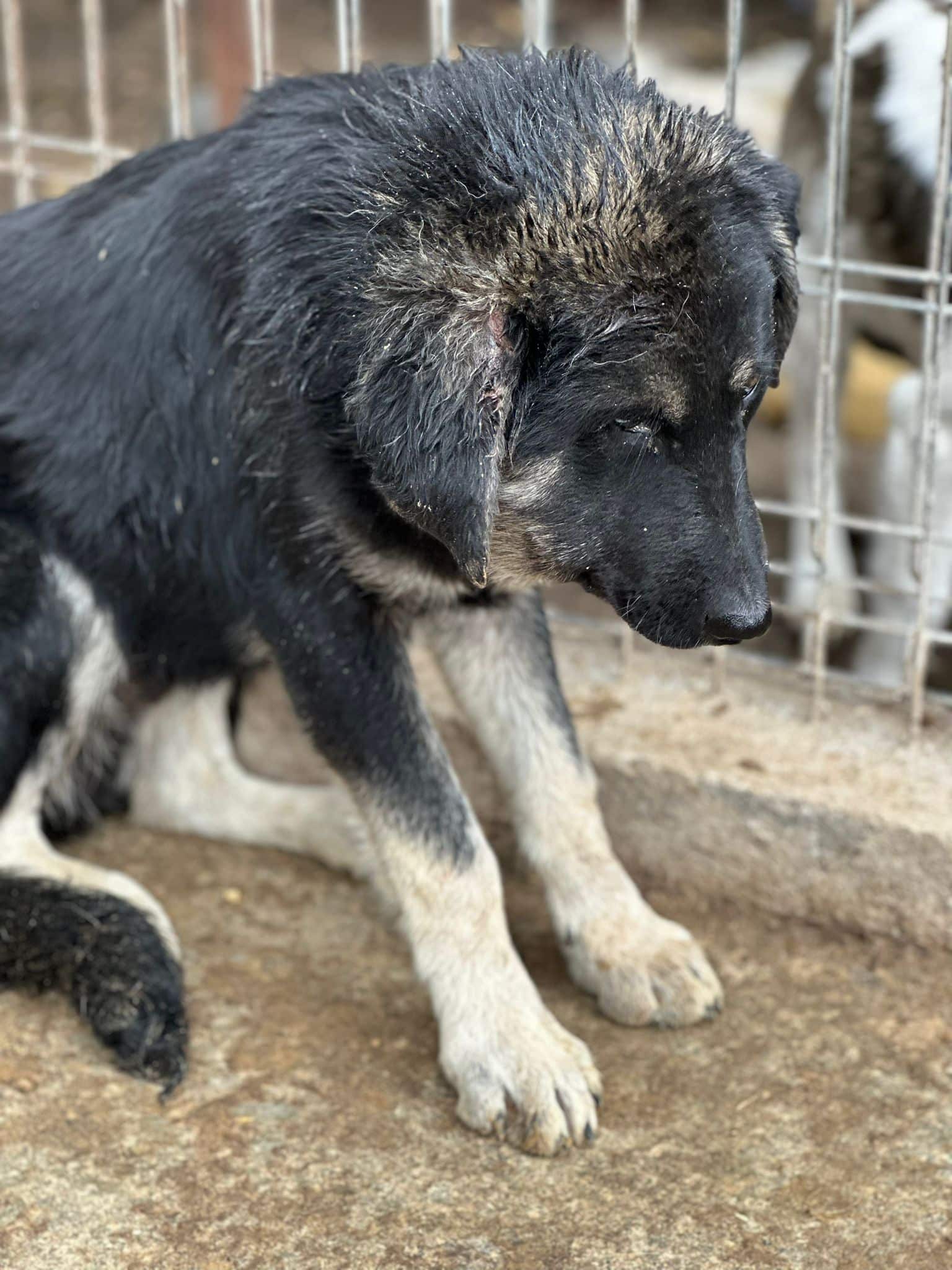 Der liebe Rüde hat im Kennel Bißverletzungen erlitten. Er sitzt fix und fertig in der Ecke.