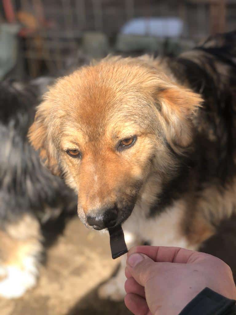 Sehr hübsche Hundedame, die sich über unsere Leckerchen sehr gefreut hat. Der kurze Besuch reichte verständlicherweise nicht aus um ihr ganzes Vertrauen zu gewinnen, aber da sie neugierig ist, würde sie sehr schnell auftauen. Sie ist bereits jetzt selbst unter Bedrängung überall anfassbar und kommt auch alleine zur Hand, wenn es was Gutes gibt. Im Rudel zeigte sie sich sehr verträglich.