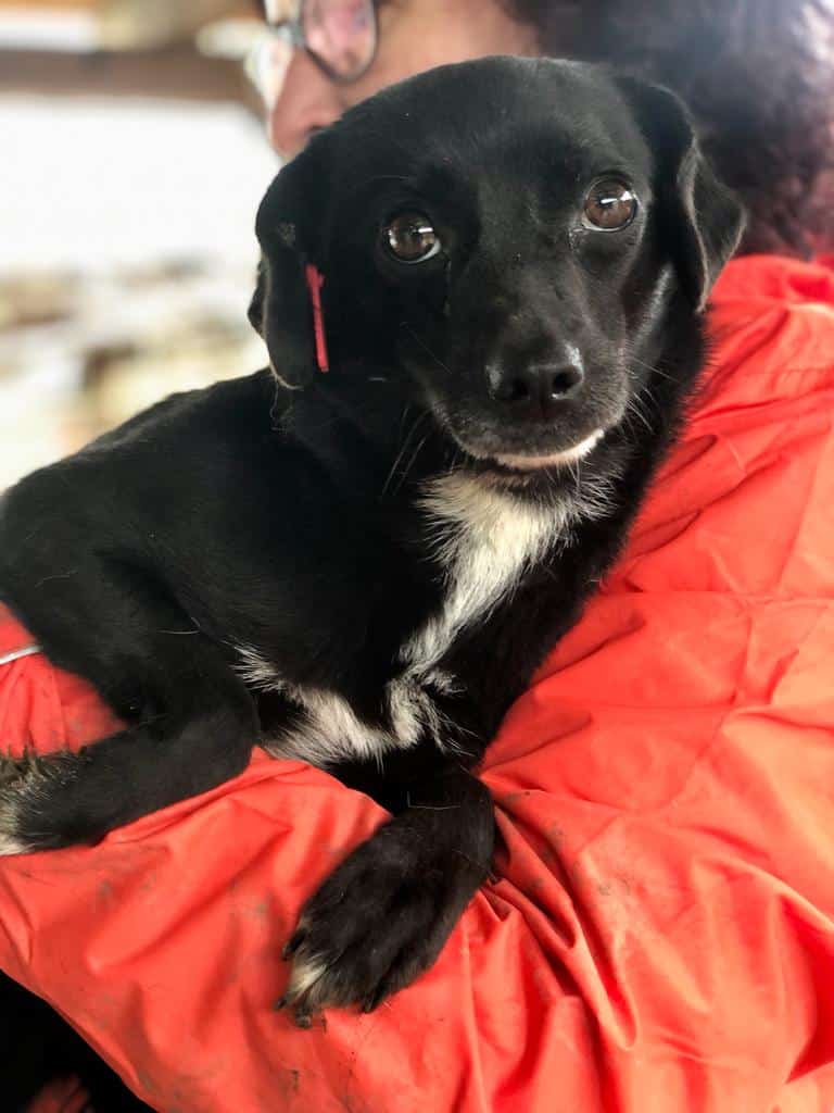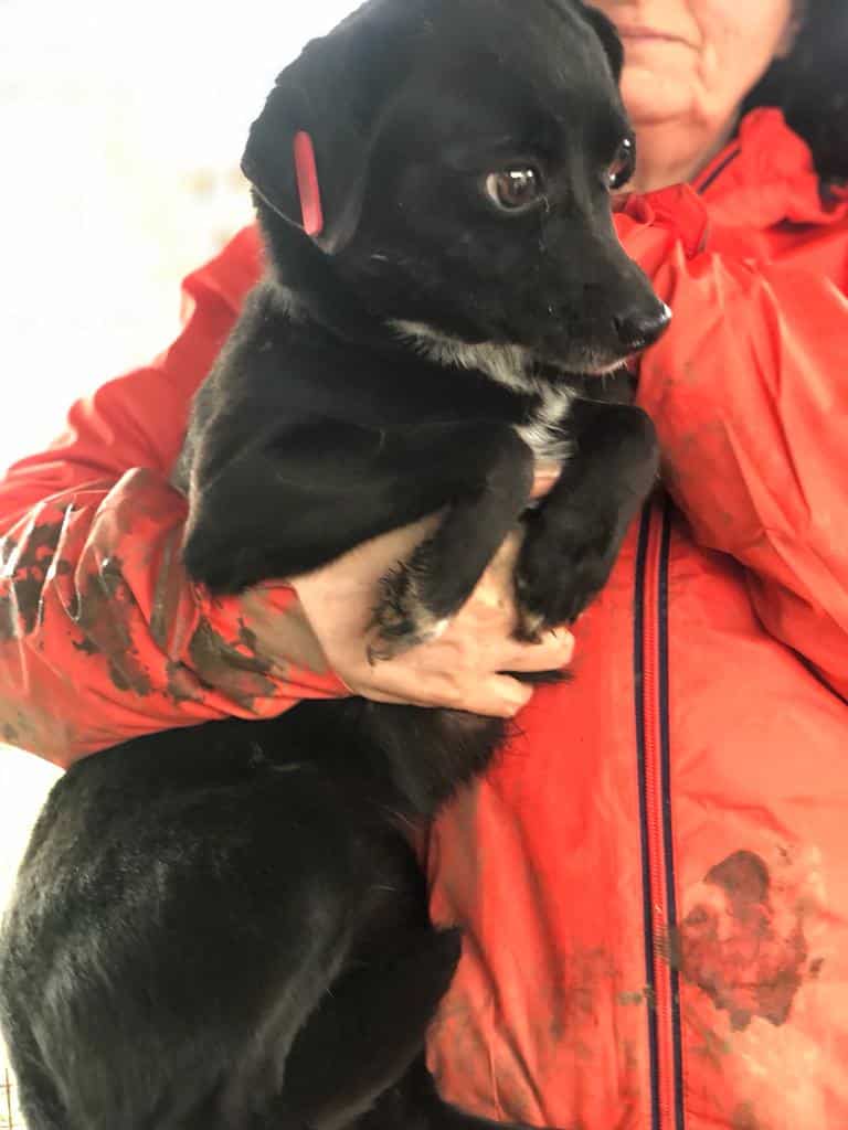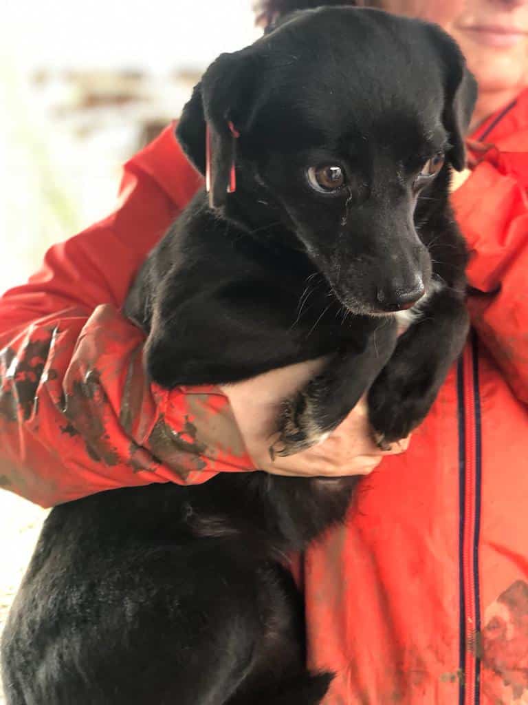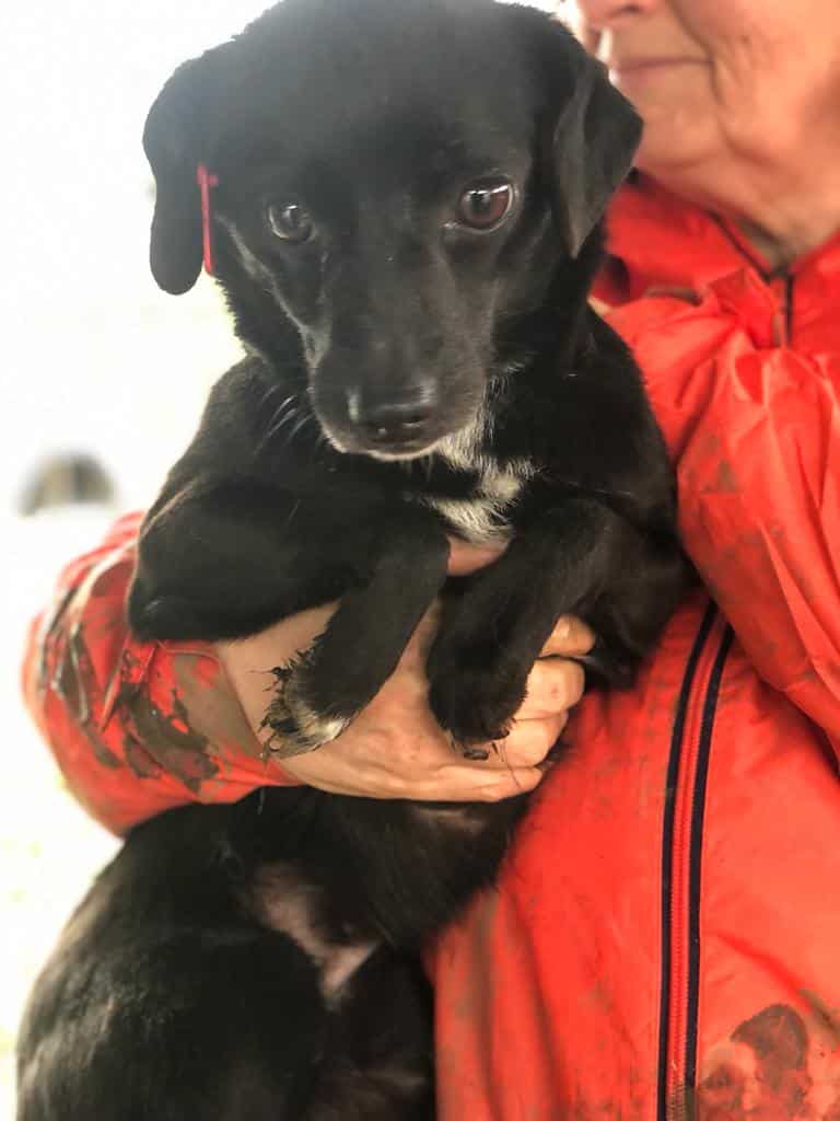 Was für eine kleine süße Minimaus. Als wir den Kennel betraten, hatte sie sich richtig gefreut. Dann verließ sie kurz der Mut und schaut uns vom Hütteneingang aus zu. Wie niedlich sie ist. Wir konnten sie gut auf den Arm nehmen und behutsam streicheln. Ein ganz kleiner und zarter Körper. Viel wird sie nicht wiegen und soo süß. Sobald sie etwas Vertrauen gewonnen hätte, würde sie bestimmt eine ganz witzige, nette Familienhündin. Sie ist sehr verträglich.