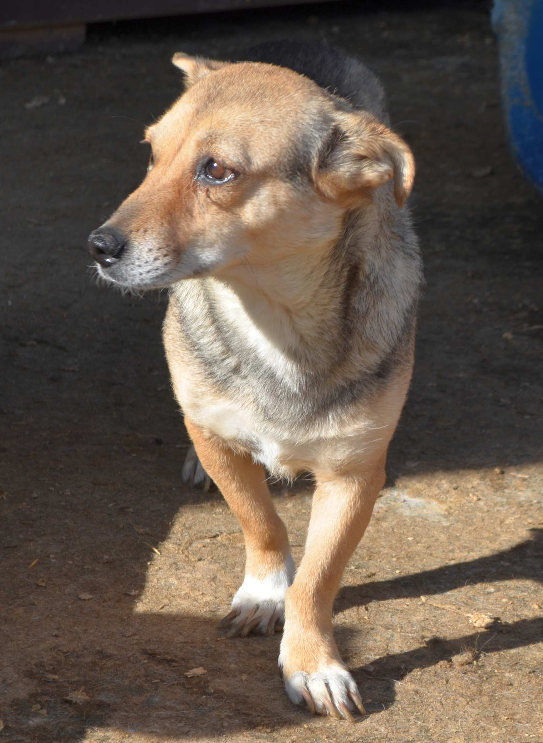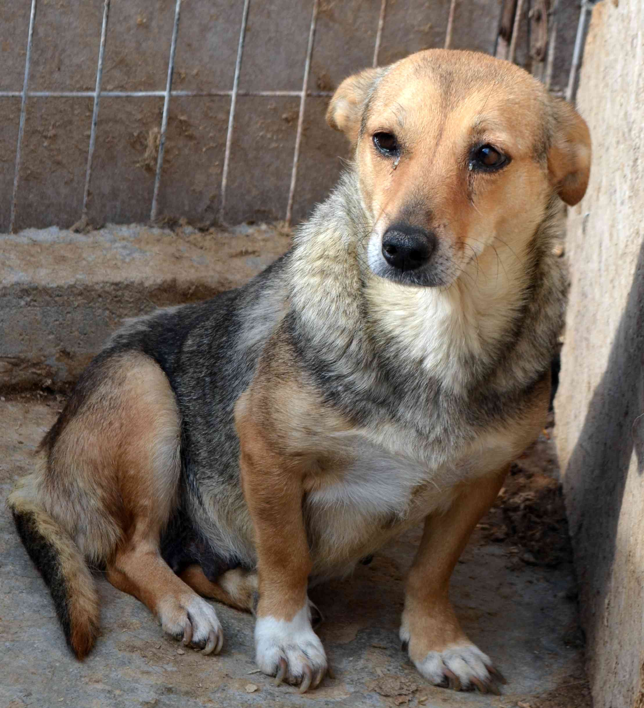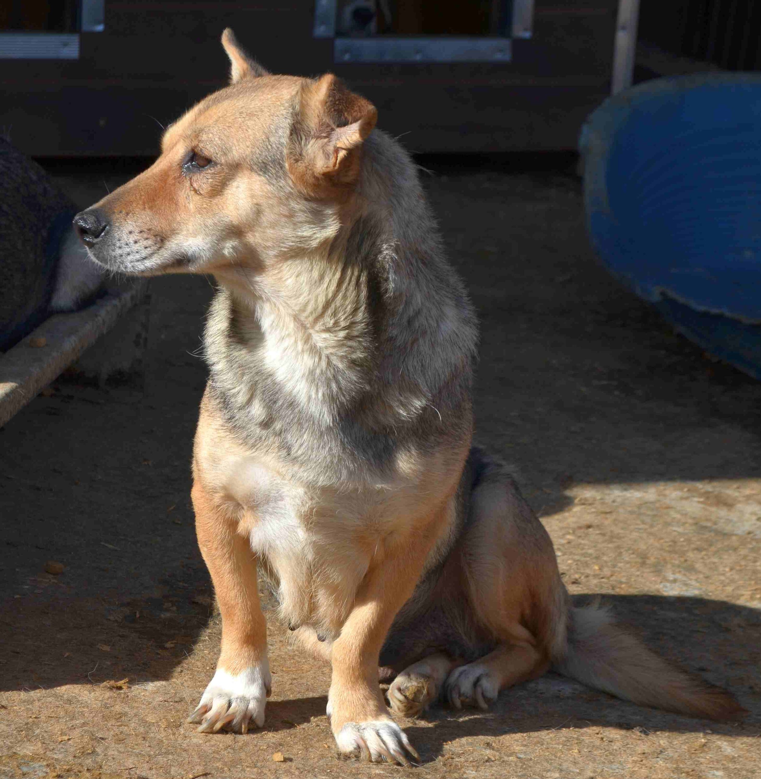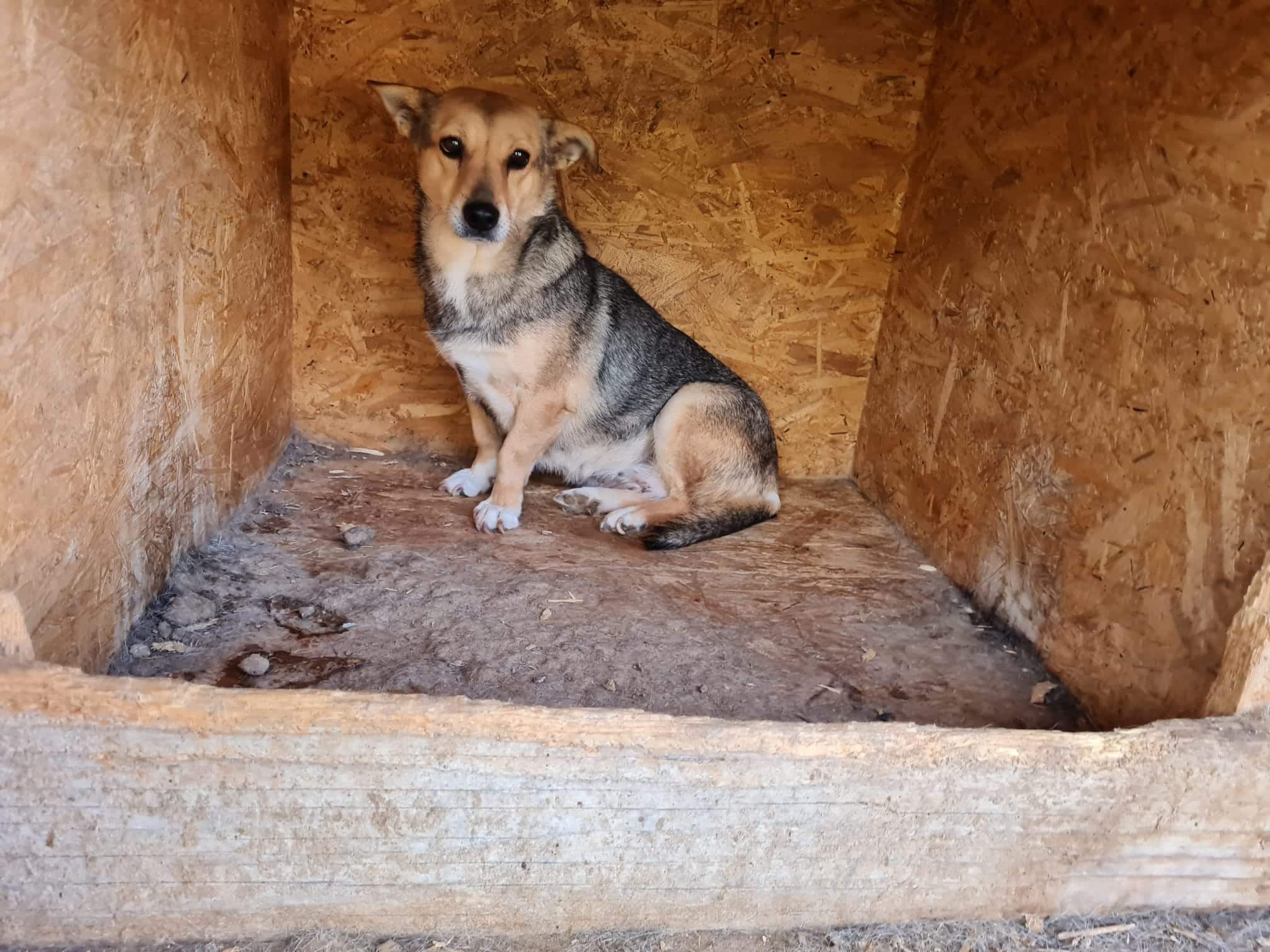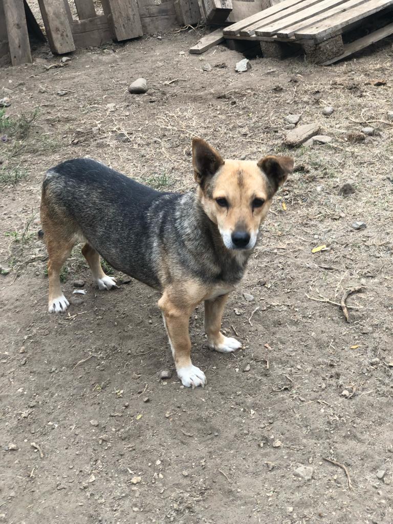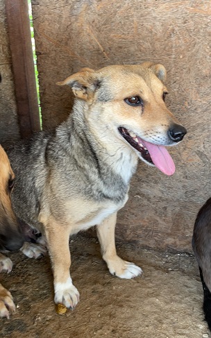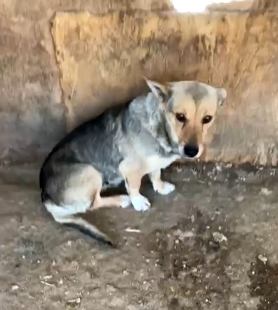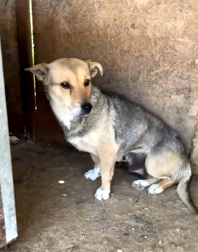 Update 10/23: Misha lebt nun in einem größeren Auslauf mit mehreren Hunden zusammen. Sie beobachtet uns aus sehr sicherer Entfernung, nimmt in Abstand von 5m auch Leckerchen vom Boden, aber flüchtet sofort, sobald man näher kommt.