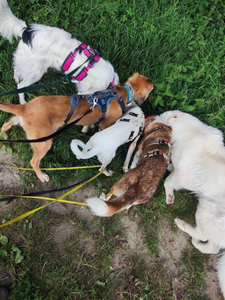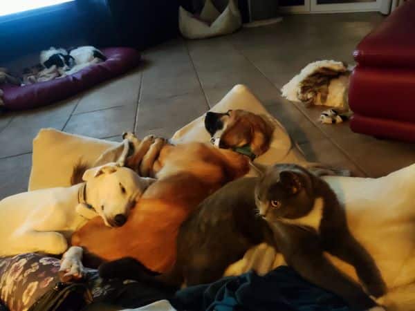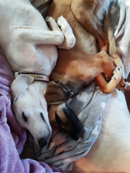 Sie lebt hier in einem Hündinnen-Rudel und mit hundeerfahrenen Katzen und es ist eine Freude sie hier zu haben. Sie versteht sich ausnahmslos mit jedem Hund, auch fremde werden freundlich begrüßt. Sie spielt mal etwas wild, mal liebevoll im Körbchen mit ihrer PS-Schwester Qulla. Zu ihr hat sie ein besonders liebevolles Verhältnis, die beiden liegen oft zusammen.
