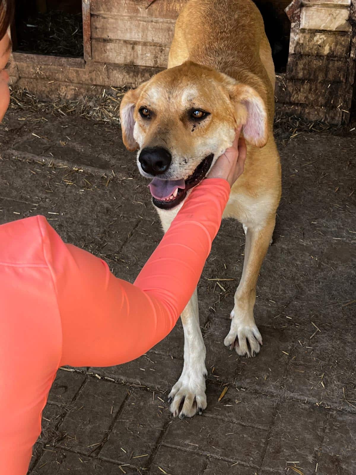 MOJO traute seinen Augen nicht, als er uns sah, und freute sich. Direkt kam er aus der Hütte und tänzelte rum, natürlich war es die Unsicherheit aber er war bei uns und hatte extrem Lust auf unseren Besuch. Etwas zaghaft nahm er unsere Leckerlis doch dann bekam er Zärtlichkeiten und die waren so toll. Er legte den Kopf auf der Hand unserer Volontärin ab und hat einfach genossen.