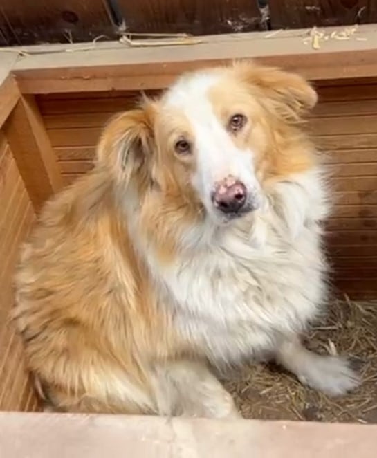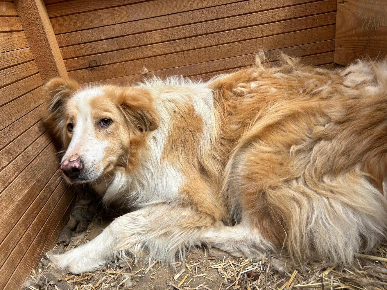 Diesen hübschen Hund MOMOA unbekannten Geschlechts fanden wir in der Hütte vor. Als wir das Hüttendach öffneten, schaute MOMOA neugierig heraus, um zu schauen, was passiert. MOMOA legte sich dann aber sofort wieder auf den Hüttenboden. In der Hütte konnten wir MOMOA problemlos anfassen. MOMOA kennt es nicht und hat es lediglich über sich ergehen lassen, zeigte dabei aber auch weder Abwehr- noch Fluchtverhalten.