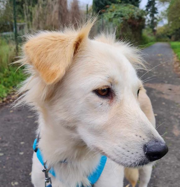 Wir vermuten, dass Moni mit einer Fangschlinge eingefangen wurde, sie ist sehr sensibel bezüglich Zug auf dem Halsband und auch des Geschirrs. Mit einer souveränen aber feinfühligen Führung lässt sie sich aber prima leiten und wir denken, dass sich dies in naher Zukunft auch geben wird. Sie lernt schnell, ist generell neugierig und aufmerksam. Struktur und Routine nimmt sie dankbar an und orientiert sich schnell daran. Sie ist generell überall anfassbar, lässt alles brav über sich ergehen (beispielsweise Abtrocknen der Pfoten, Hochheben, etc.) und bleibt stets devot.