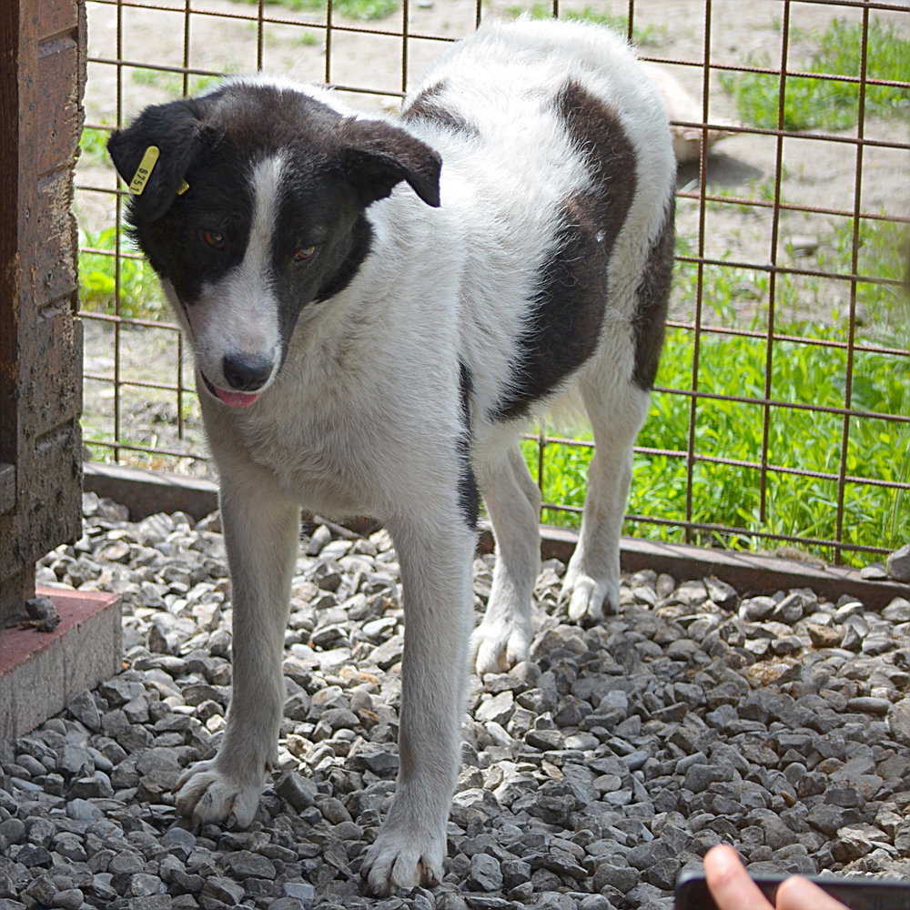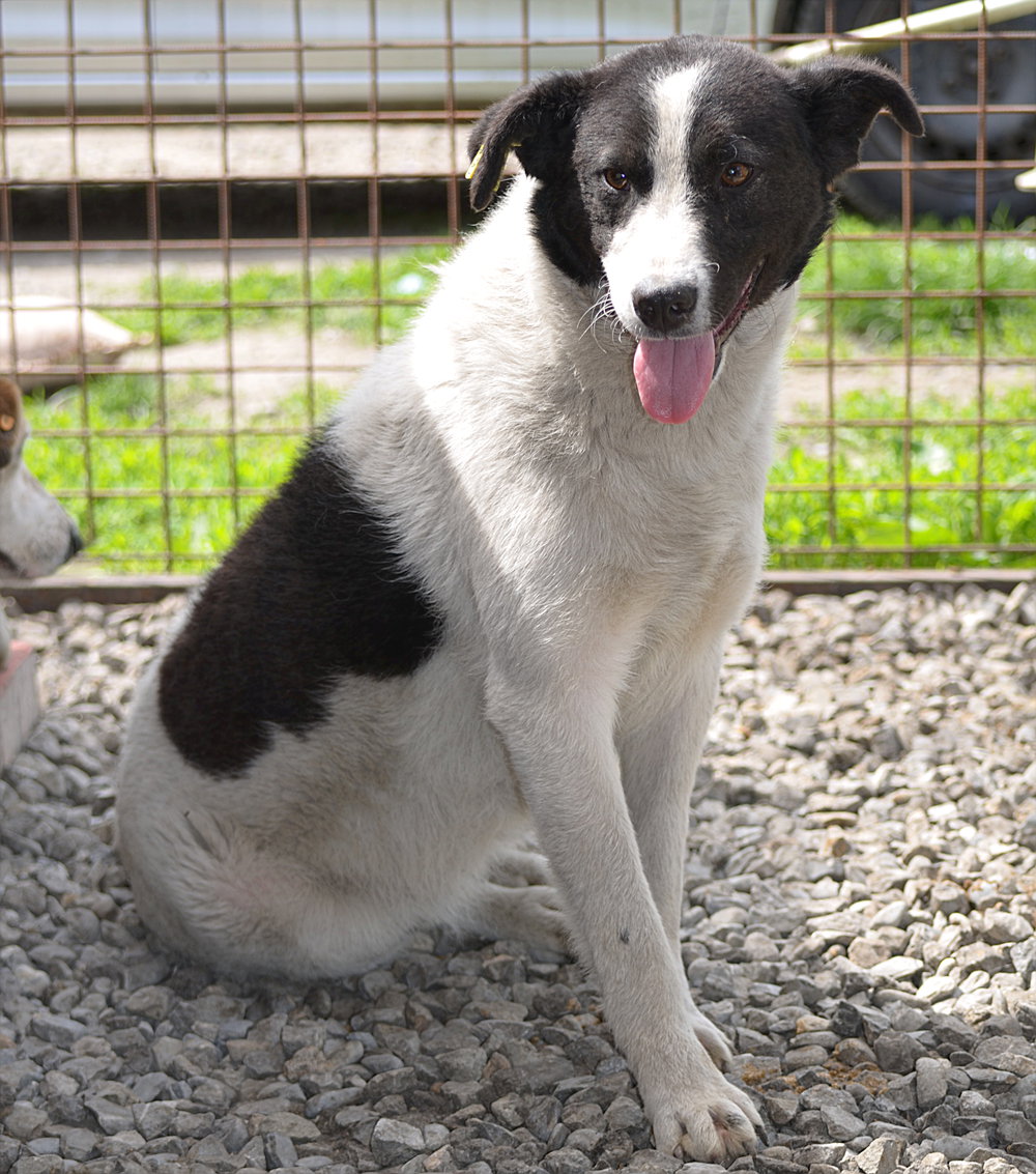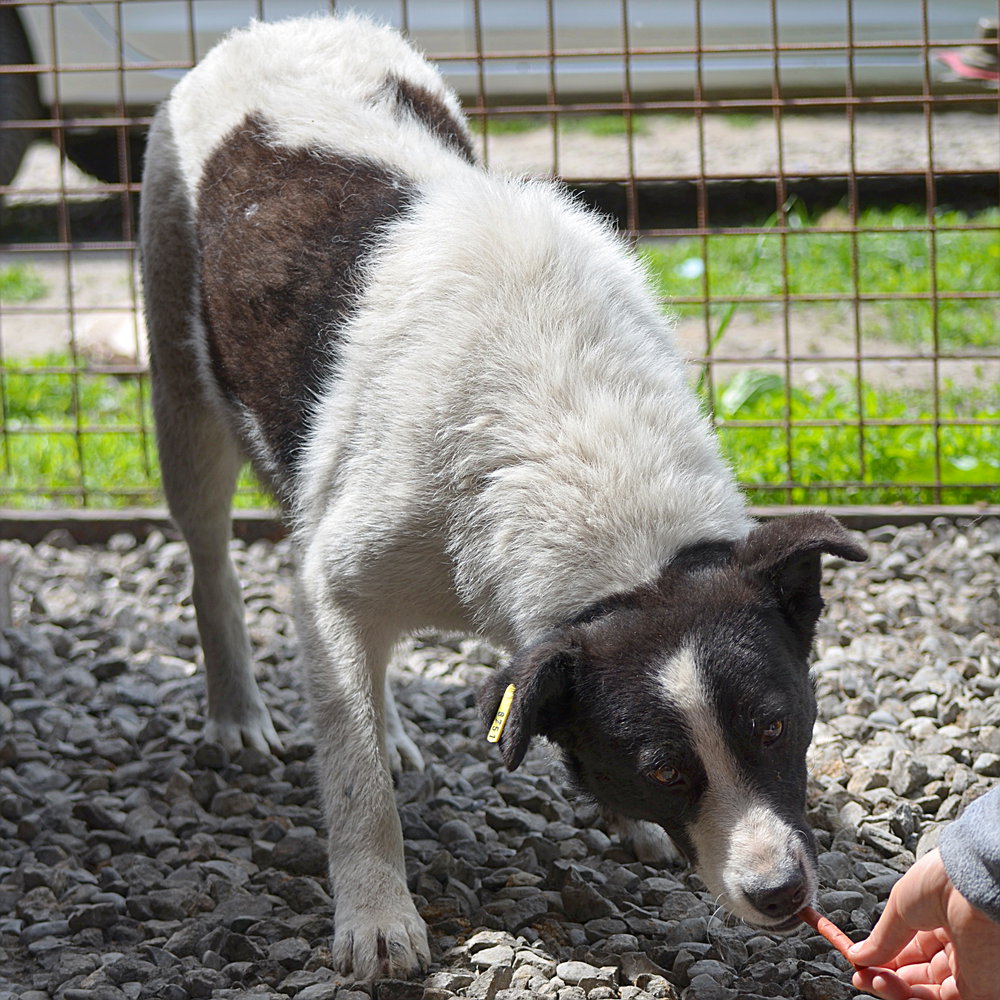 Die hübsche Hündin begrüßte uns freundlich und neugierig im Kennel. So ganz konnte sie unseren Besuch aber nicht einordnen und hielt zunächst noch Sicherheitsabstand. Nach ein paar Minuten fasste sie sich ein Herz und nahm die angebotenen Leckerli gerne aus der Hand. Zu mehr fehlte ihr aber noch der Mut.