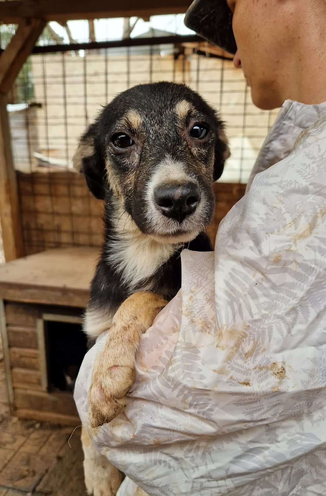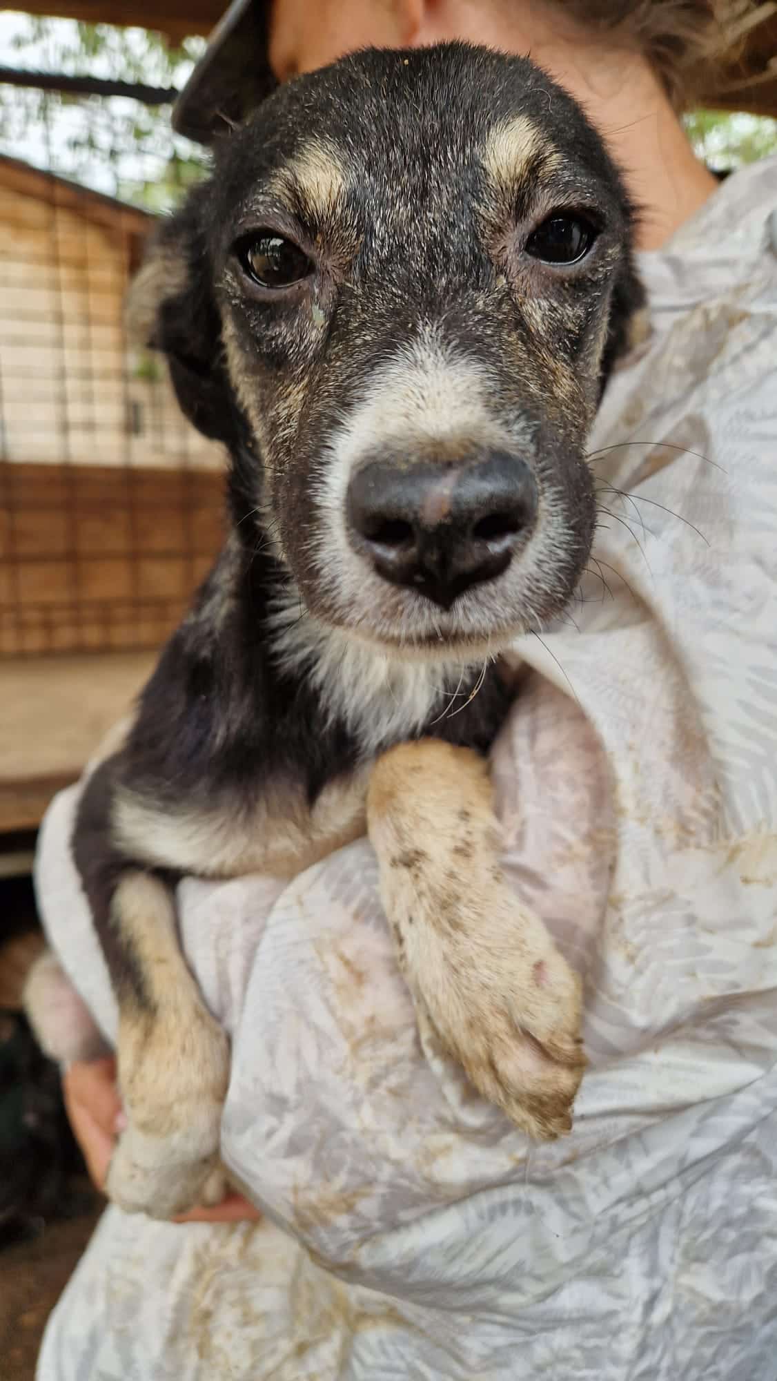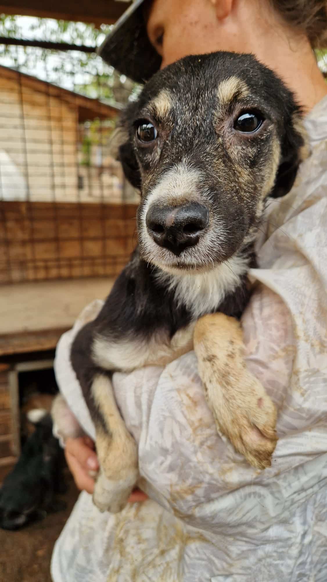 Die zarte MONTANA hatte sich hinter einer Hütte versteckt, als wir in ihrem Kennel waren. Völlig problemlos hat sie sich rausholen lassen und wedelte dann verlegen, aber auch freudig mit ihrem Schwänzchen. Sie zeigte sich sehr nett, wenn auch etwas schüchtern uns gegenüber. Bei ihr sind wir sicher, dass sie binnen weniger Tage völlig aufgetaut wäre. Auch in ihrer Junghundgruppe zeigte MONTANA sich sehr verträglich.