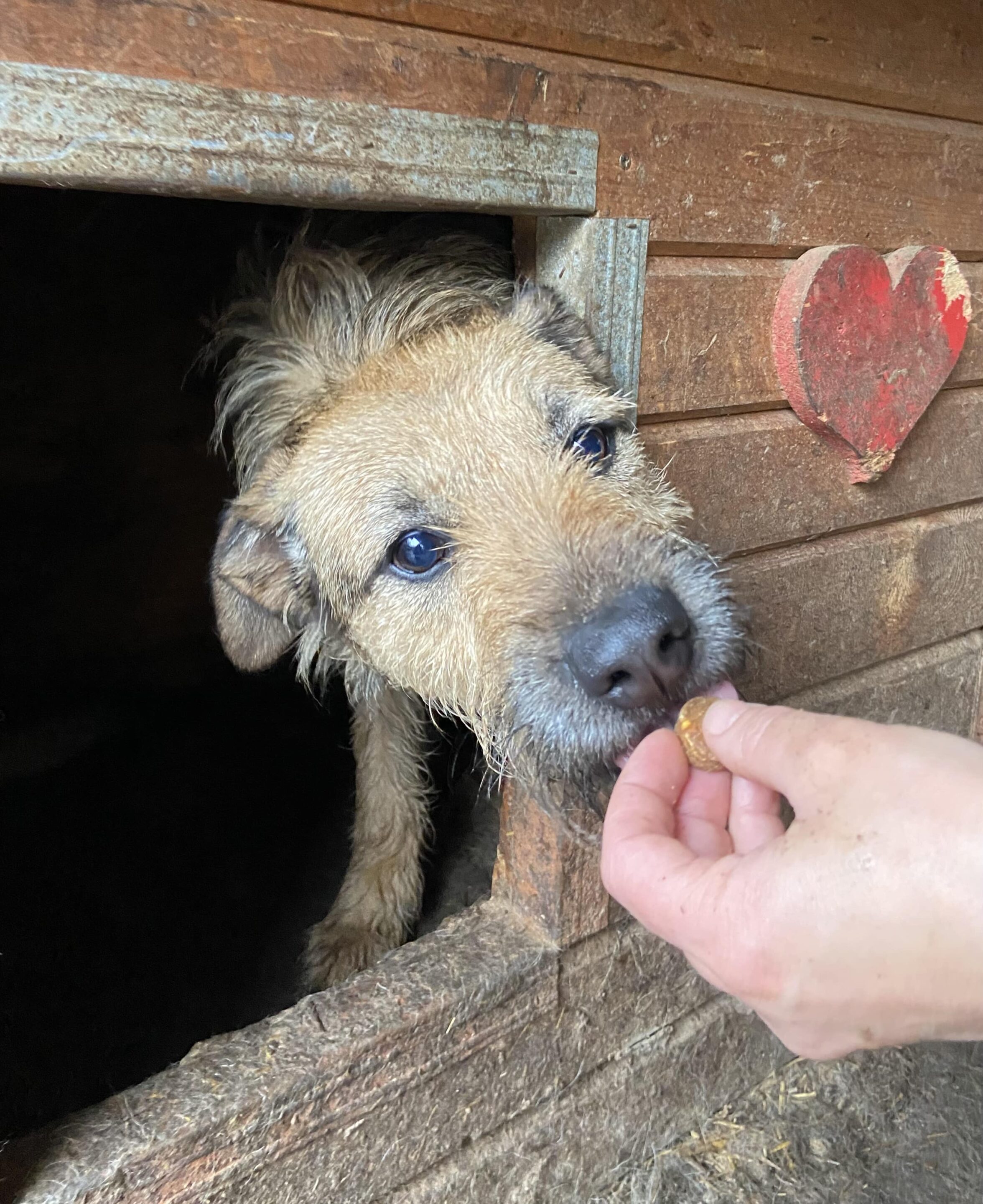 Ein scheinbar kleiner Schritt für uns, ist ein großer Schritt für MORO. Wir durften den zauberhaften Rüden dieses Mal in seiner Hütte behutsam an Brust und Beinchen berühren. Diese Nähe ist neu und deshalb ungewohnt für ihn, weshalb er sie noch nicht genießen konnte. MORO kennt das Zusammenleben mit uns Menschen einfach nicht und hat nie Geborgenheit und liebevoll streichelnde Hände erlebt. Sobald wir aufhörten, ihn zu berühren, war sein Schnäuzchen wieder bei uns, um Leckerlie zu erhaschen.