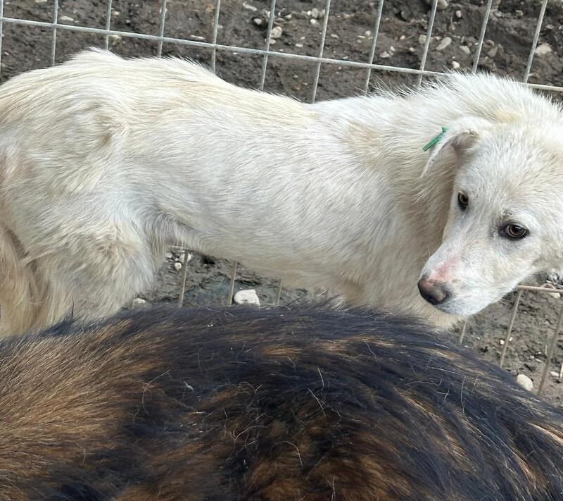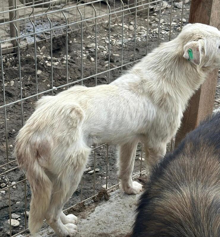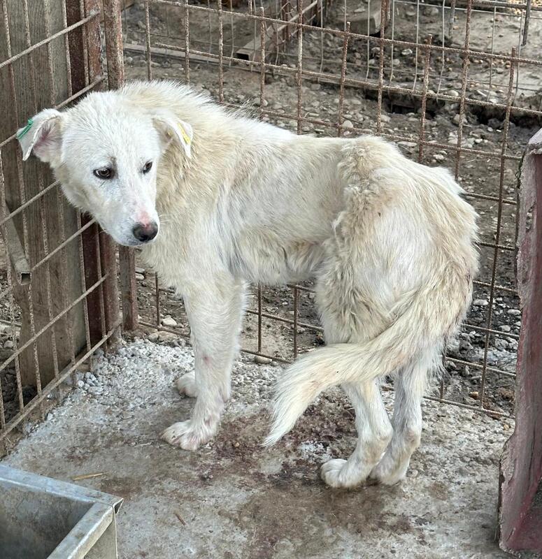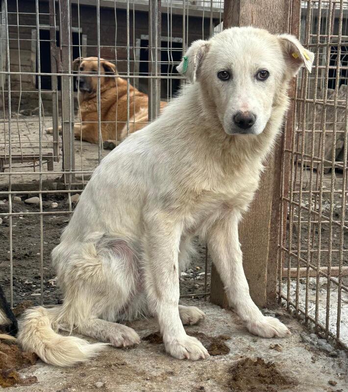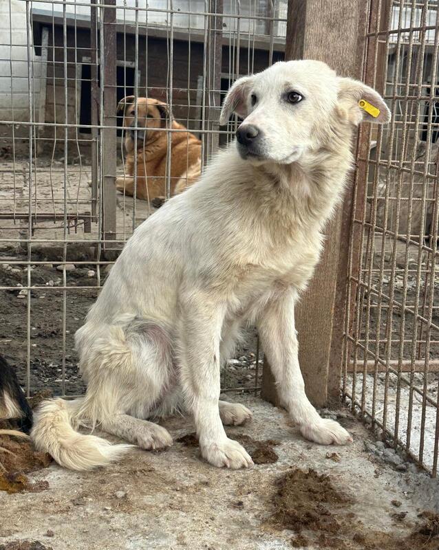 MOYRA ist neu in Bucov und wurde frisch aus dem Vetkennel in einen Außenkennel gesetzt. Als wir den Kennel betraten, hielt sich MOYRA zunächst hinter ihrer Hütte auf. Als sie schließlich näher kam, fiel uns sofort auf, dass sie viel zu dünn ist. Ihre Rippen und Hüftknochen waren deutlich zu erkennen. Immer wieder lief sie um uns herum, jedoch hatte sie nicht genug Mut, sich streicheln zu lassen oder Leckerlies anzunehmen.