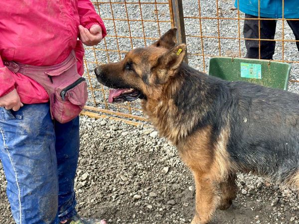 Dieser Schäferhund saß in einem Kennel alleine. Wir wissen nicht, ob seine Verträglichkeit getestet wurde. Abgabehunde, was bei einem sehr wahrscheinlich reinrassigen Schäferhund naheliegt, werden meist lieber direkt einzeln gesetzt. Er zeigte auch am Zaun das typische Schäferhundverhalten mit auf und ab laufen. Er wird ein ausgeprägteres Wachverhalten haben. Uns Menschen gegenüber war er interessiert, aber auch schnell wieder desinteressiert. Also nicht extrem Menschen bezogen. O.K., wenn wir da sind, das ist er also gewohnt, aber er brauch keine ständige Aufmerksamkeit. Wir haben ihn nicht bedrängt, daher können wir dazu keine Aussagen treffen. Sein angezüchteter abfallender Rücken lässt eine HD Problematik vermuten.