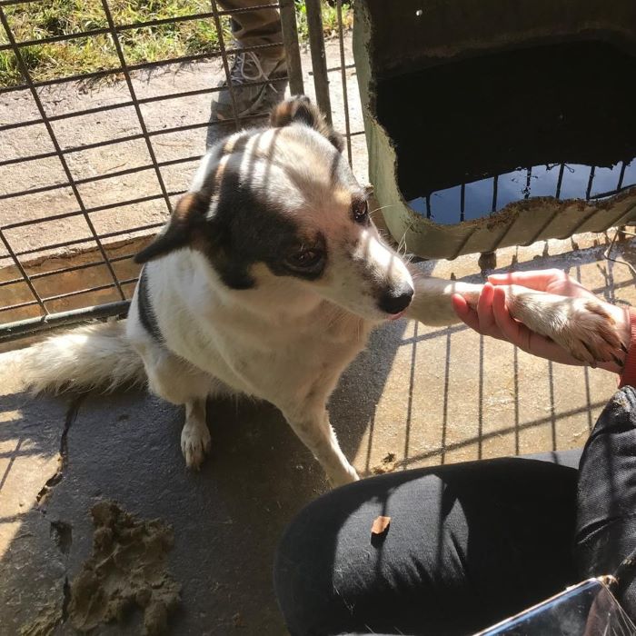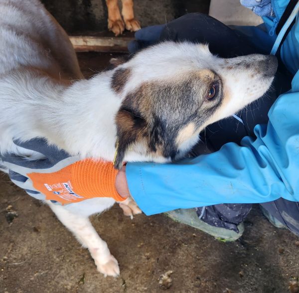 Wir trafen diese eher ruhige Hündin im Vetkennel an. Sie war sehr gestresst und unentspannt, was man ihr in dieser Situation auch nicht verdenken kann. Sie nahm von sich aus den Kontakt zu uns auf, ließ sich anfassen und nahm unsere Leckerchen gern an, dennoch hatten wir die ganze Zeit das Gefühl als wäre sie etwas misstrauisch. Möglicherweise hat sie bisher keine oder gar ungute Erfahrungen mit Menschen gesammelt, sodass sie immer ein wenig auf der Hut war, weil sie etwas schlechtes erwartet.