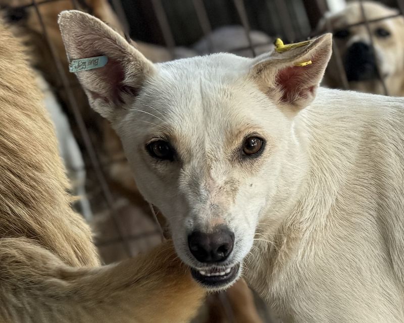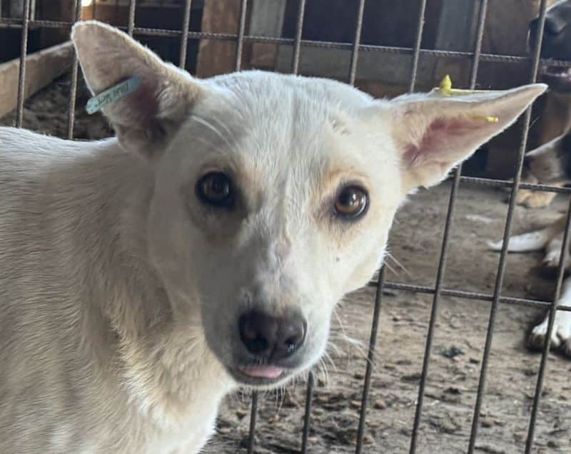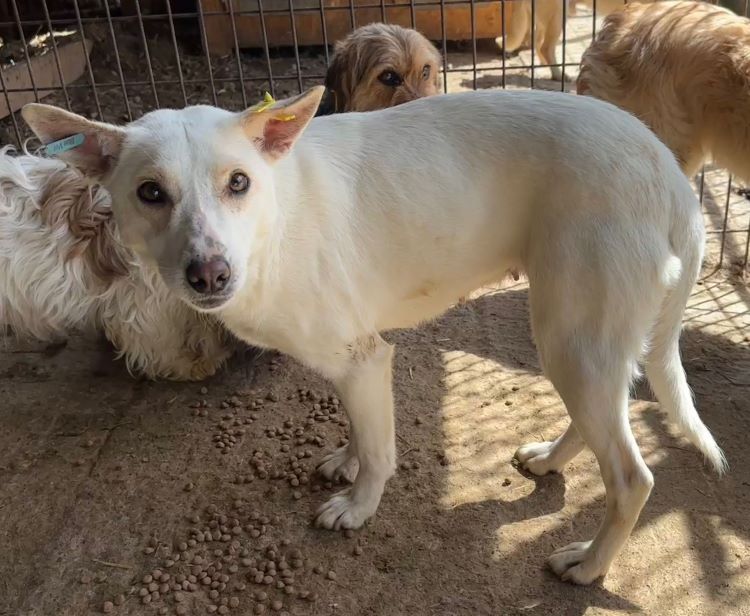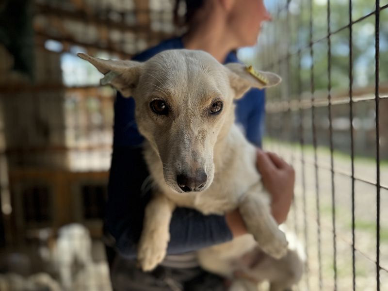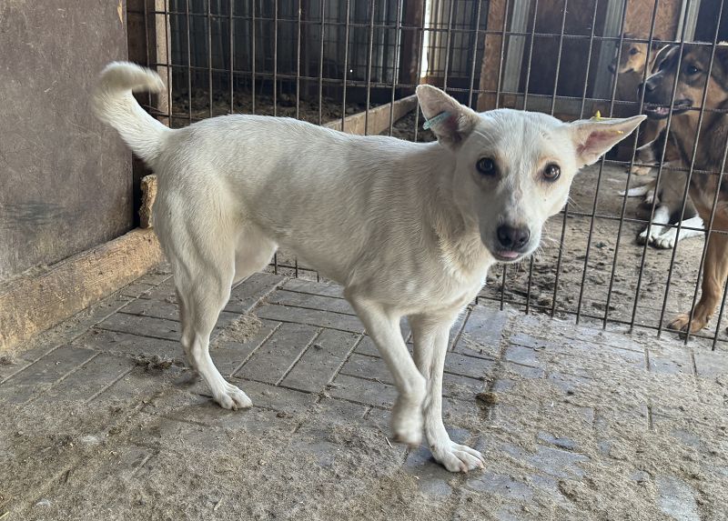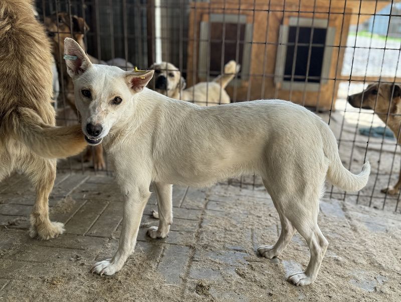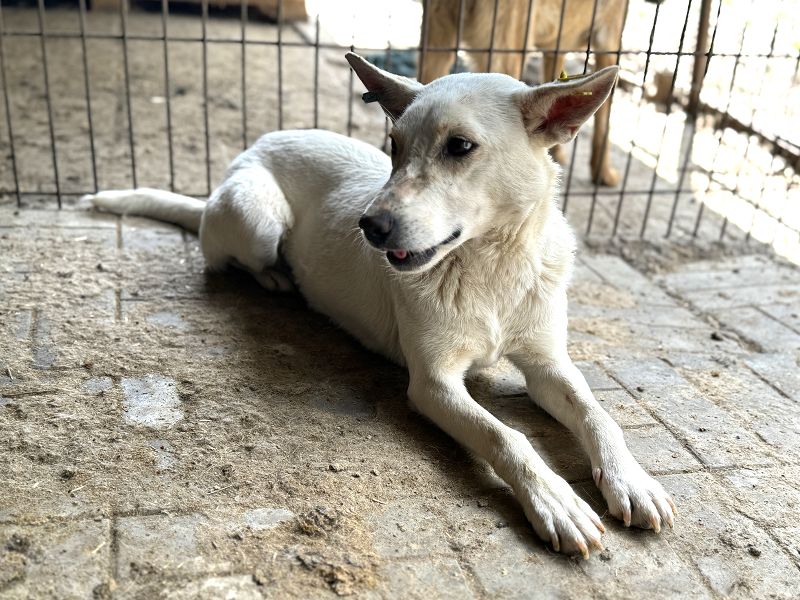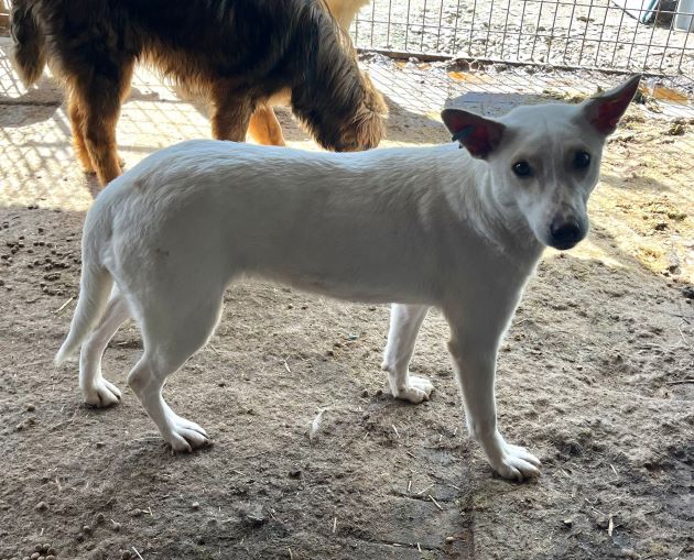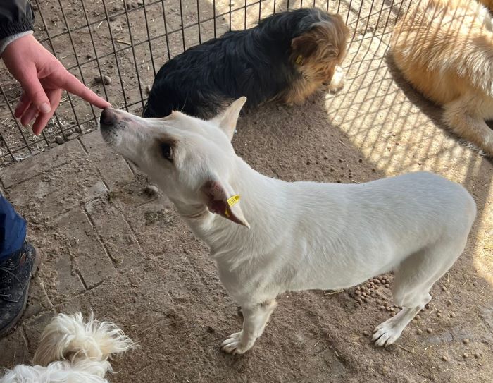 Als wir die weiße Naima im Mai‘24 in ihrem Gruppenzwinger besucht haben, zeigte sie sich zunächst skeptisch. Sie nahm zwar zögerlich Leckerchen entgegen, wollte sich aber nicht anfassen lassen. Erst als wir sie bedrängten und sie nicht mehr ausweichen konnte, ließ sie sich von uns streicheln. Sie hat dann recht schnell erkannt, dass von uns keine Gefahr ausgeht und ließ sich auf den Arm nehmen. Dort wirkte sie auch entspannt und ließ sich von uns kraulen. Jetzt fehlt dieser sensiblen Seele nur noch das passende Zuhause, um mit geduldiger Führung wieder aufblühen zu können. Da sie verträglich mit anderen Hunden ist, könnte ihr ein souveräner Ersthund eine gute Hilfe sein. Das ist aber kein Muss.