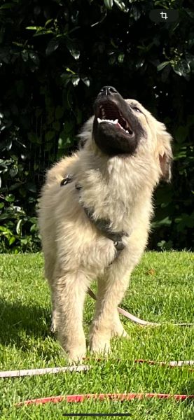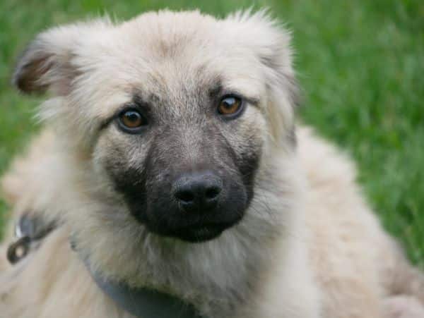 Weiches Flauschfell in hellem beige, dunkler Fang, puschelige Hängeöhrchen und die Rute recht gerade getragen