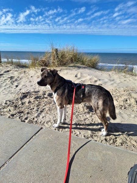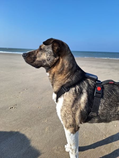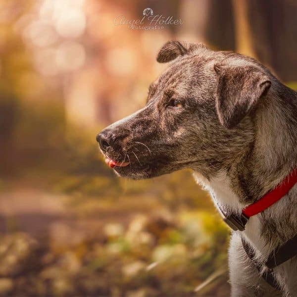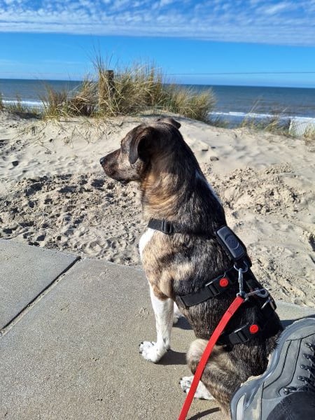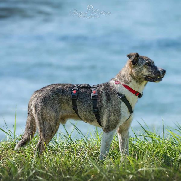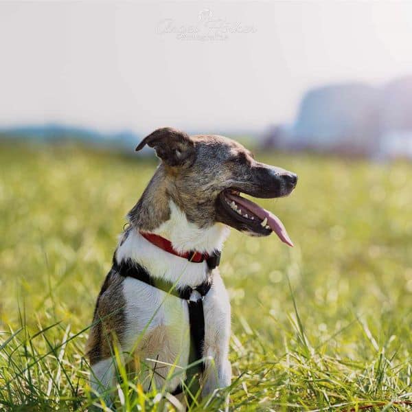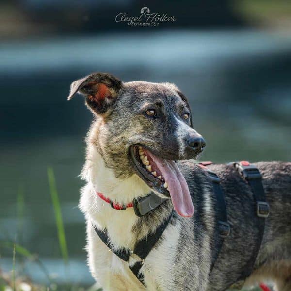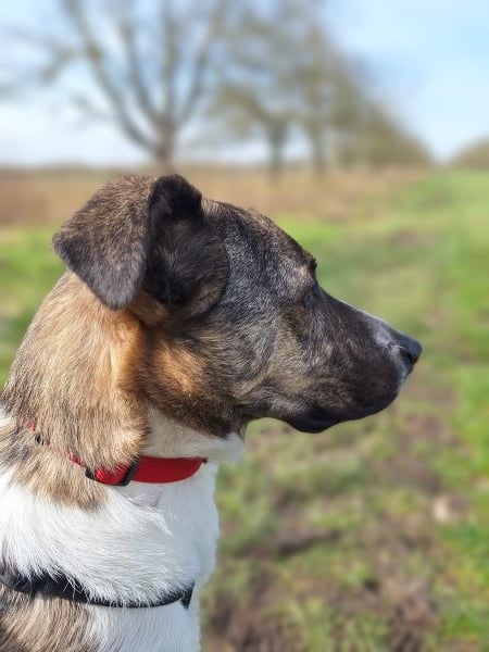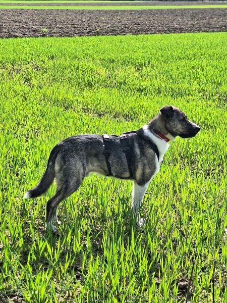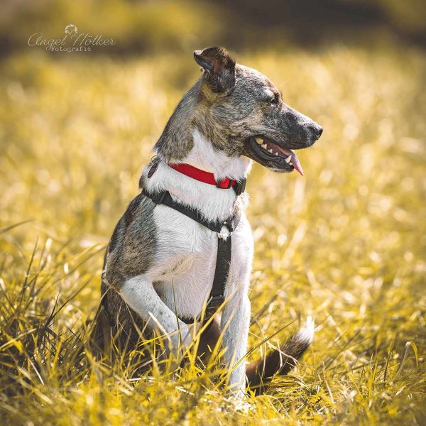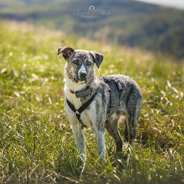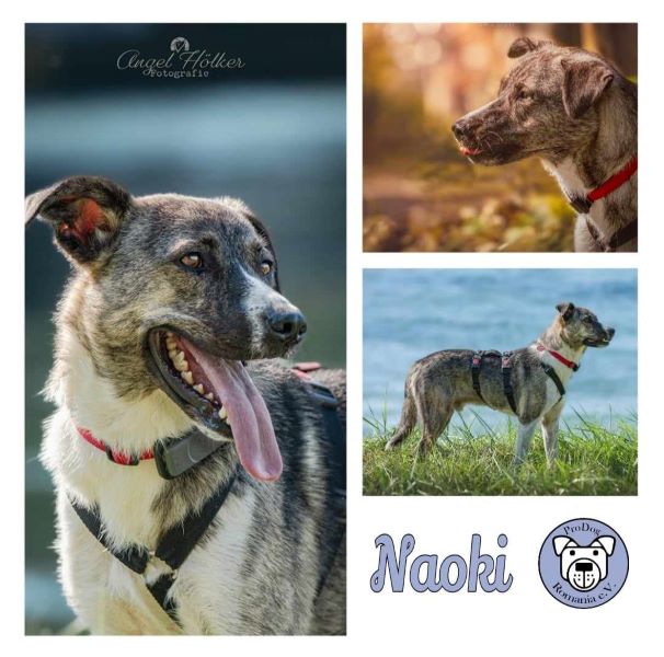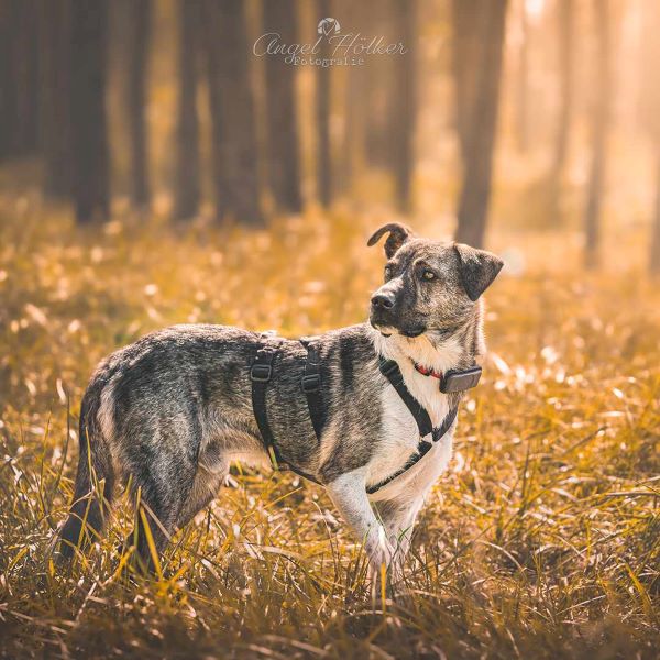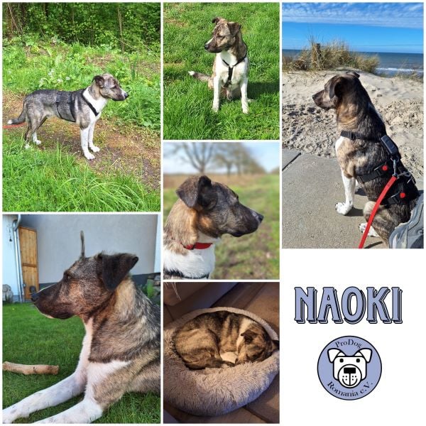 Unser kleiner Wirrkopf hat bereits viel gelernt, steht sich aber oft noch ein wenig selbst im Weg. Naoki benötigt eine Bezugsperson, an der er sich orientieren kann, die ihm Sicherheit vermittelt. Hat er diese gefunden, läuft er prima an der Leine und findet Spaziergänge in der Natur großartig.