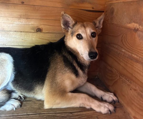 NAYA ist eine sehr unsichere Hündin, die sich überwiegend in der Hütte vor uns versteckt hat. Auch mit Leckerlis konnten wir sie nicht locken. Dafür konnten wir sie in der Hütte aber problemlos streicheln. Es bereitete ihr jedoch sichtlich großes Unbehagen.
