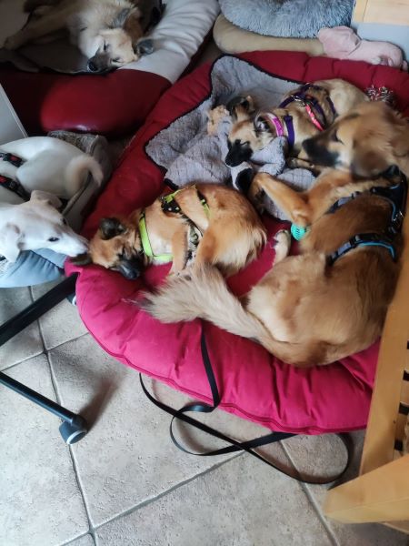 Sie lebt hier in einem Hündinnenrudel aus groß und klein und jung & alt und versteht sich mit allen gut. Neu hinzukommende Hunde begrüßt sie ebenfalls freundlich, wenn sie spielen mögen, umso besser. Die hundeverständigen Katzen gehören zum Rudel, mit ihnen kommt sie ebenfalls wunderbar aus. Mit einem oder mehreren Hunden zusammen kann sie bereits eine kurze Zeit allein bleiben, das muss noch weiter geübt werden. Ganz alleine bleiben kennt und mag sie nicht.