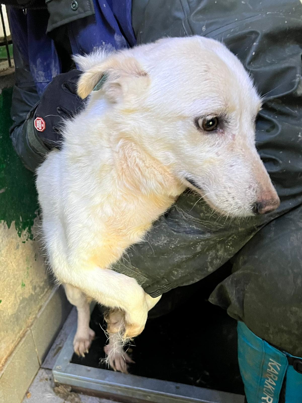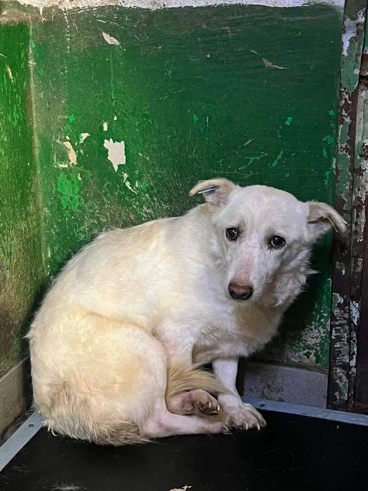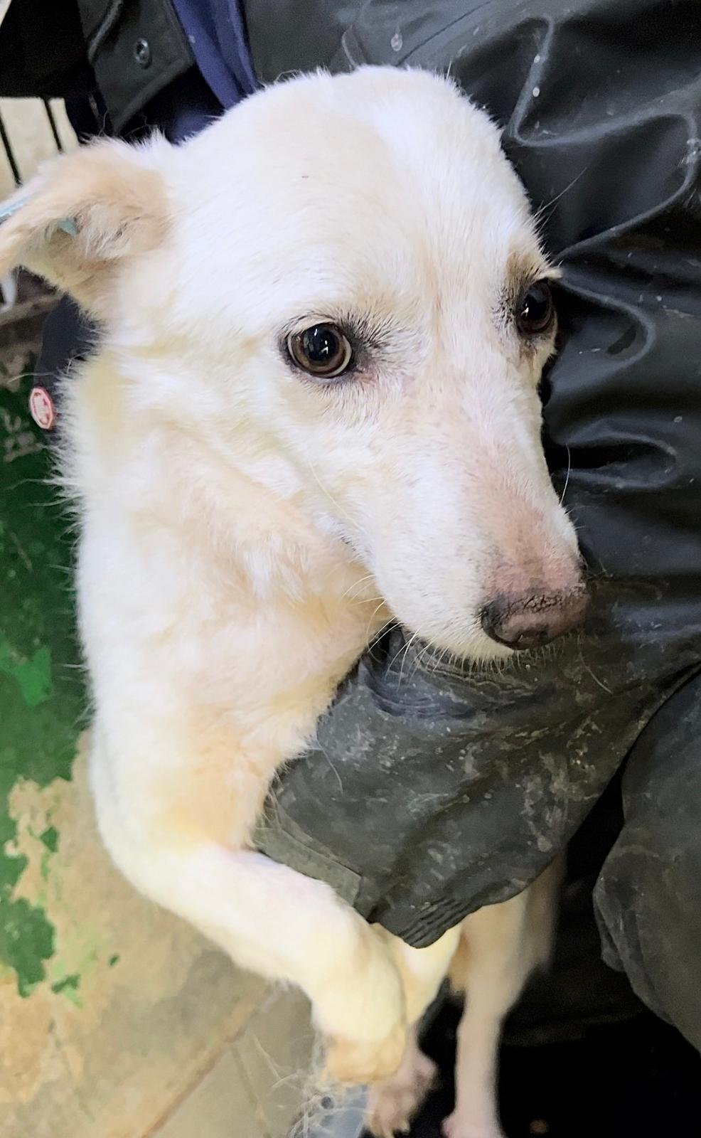 Kleine, weiße Hündin, die sich etwas scheu zeigte. Im ersten Moment zeigte sie leichtes Abschnappverhalten, aber da dies kein Erfolg hatte, ließ sie die Berührungen über sich ergehen und wir konnten sie auf den Arm nehmen. In der Hundegruppe zeigt sie sich verträglich.