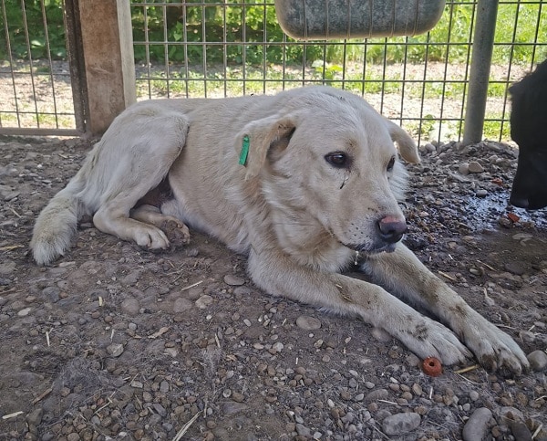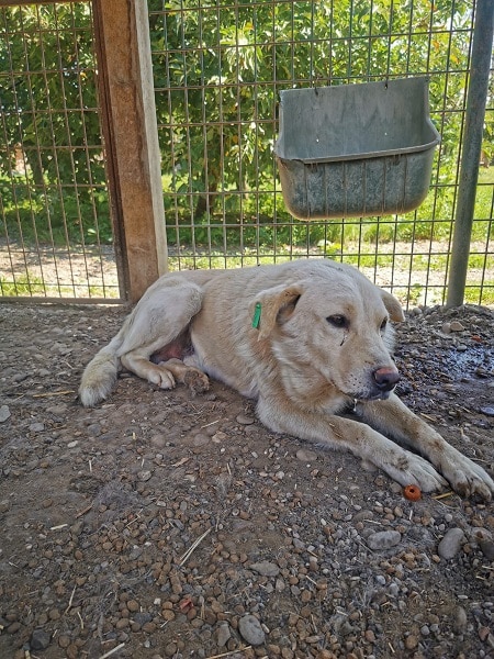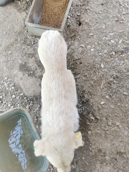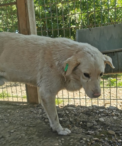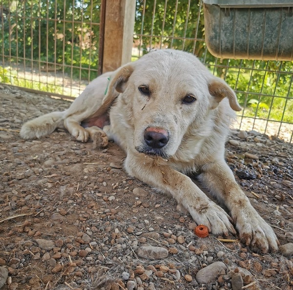 Er wirkte ziemlich müde, apathisch und resigniert. Da die meisten der Hunde in diesem Kennel anfangs leicht schläfrig waren, vermuten wir dass es noch leichte Nachwehen einer Narkose gewesen sein könnten, weil diese Hunde recht neu im Shelter waren. Er zeigt keinerlei Fluchttendenzen, weswegen wir davon ausgehen dass er nicht scheu oder ängstlich ist. Leider konnten wir keine „interessante“ Interaktion mit den anderen Hunden beobachten, die Kennelbesetzung wirkte aber alles in allem harmonisch.