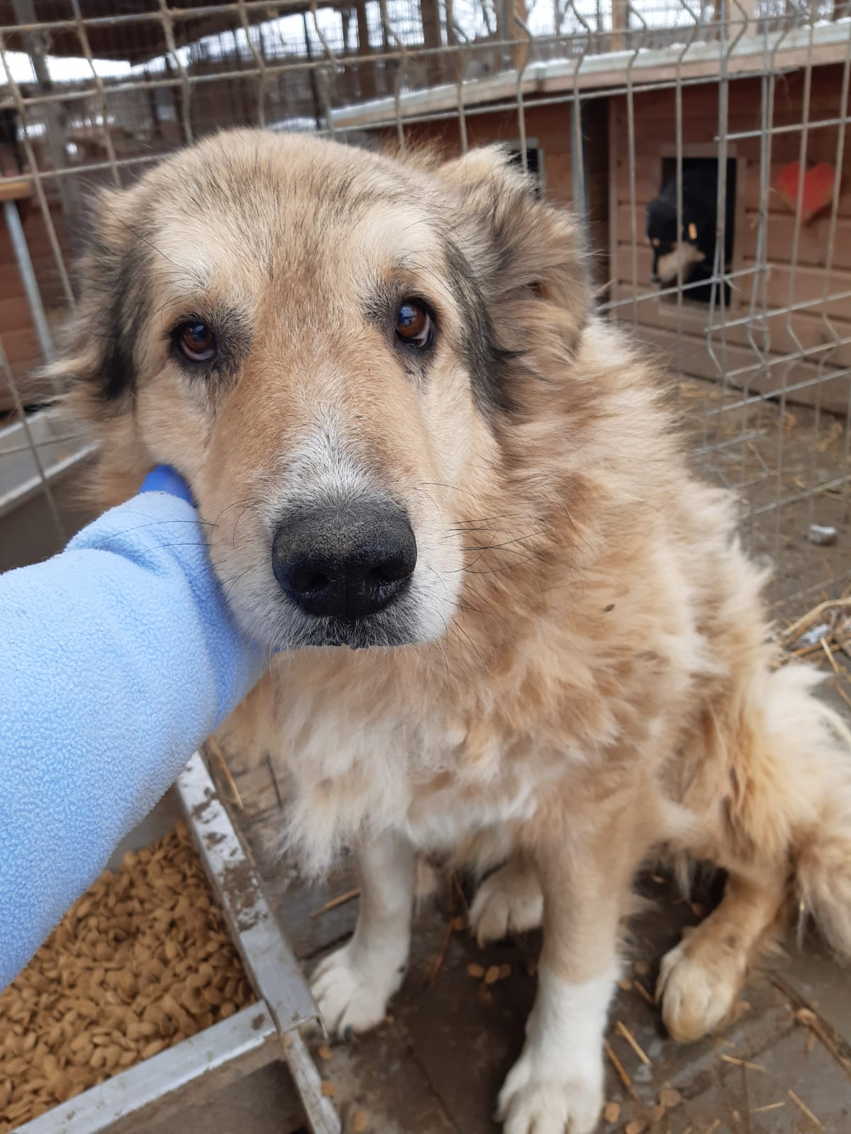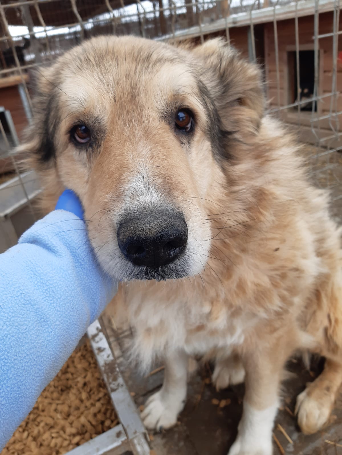 freundlich, ruhig, gut anfassbar, teilt sich seinen Kennel mit 2 jungen Hündinnen, braucht ebenerdiges Zuhause, am besten mit Garten