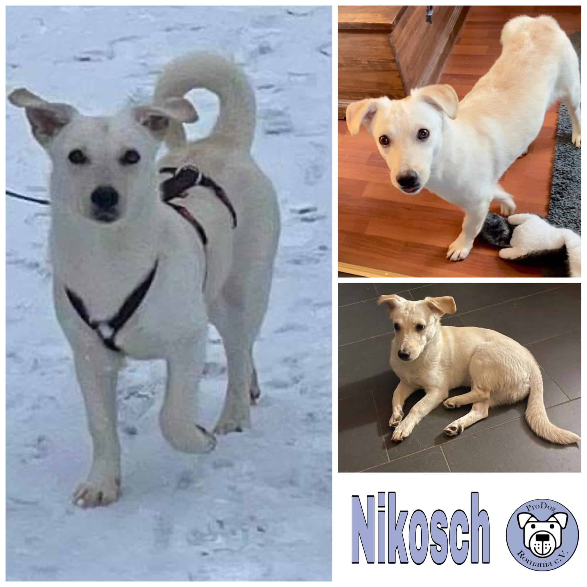 Erste Hundebegegnungen waren problemlos, da reagiert er zurückhaltend, aber neugierig. Katzen kennt er noch nicht. Autofahren liebt er (noch) nicht so sehr. Nikosch hat sehr guten Appetit und zeigt keinen Futterneid gegenüber anderen Hunden. Er mag Spielzeug jeder Art und knabbert gerne.