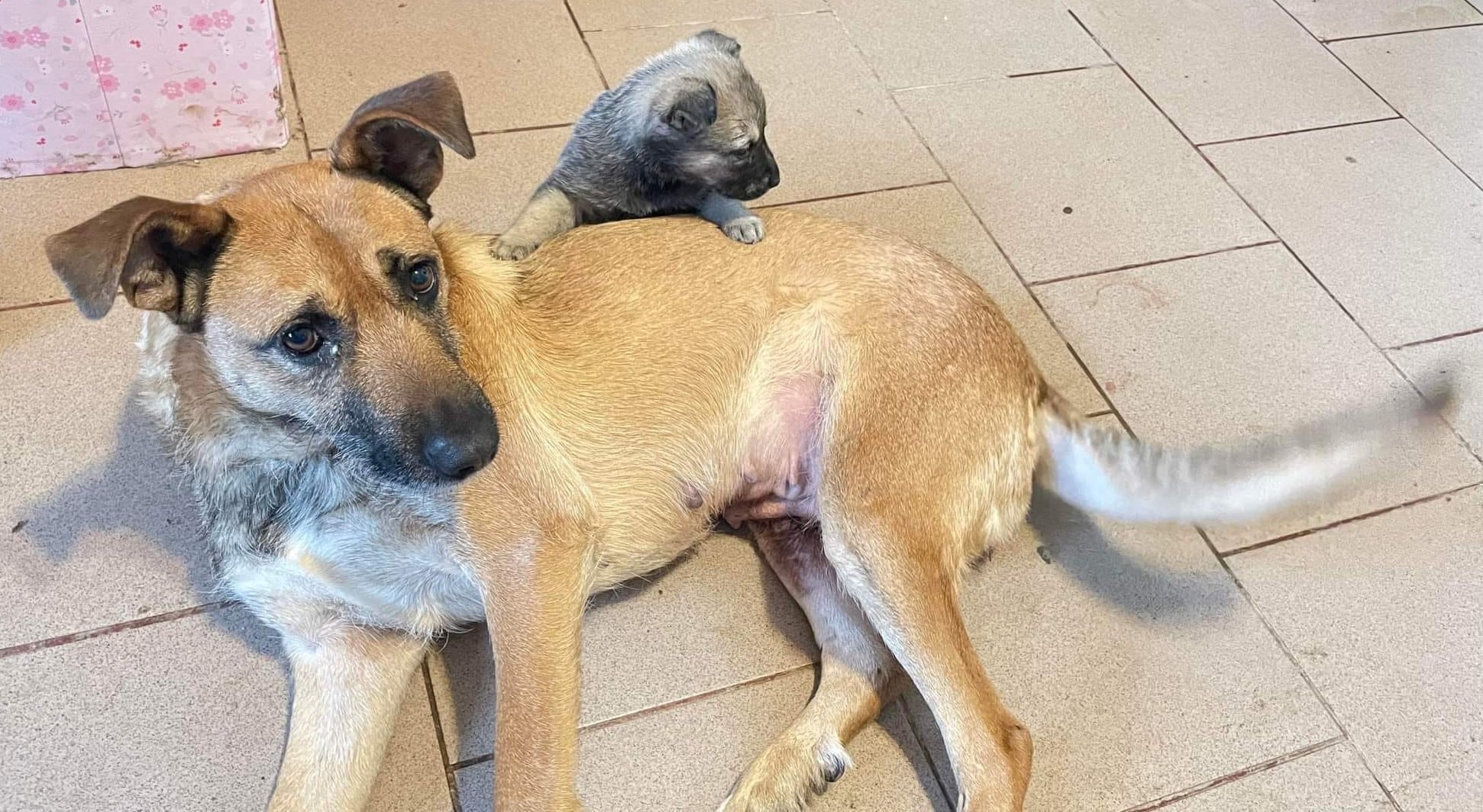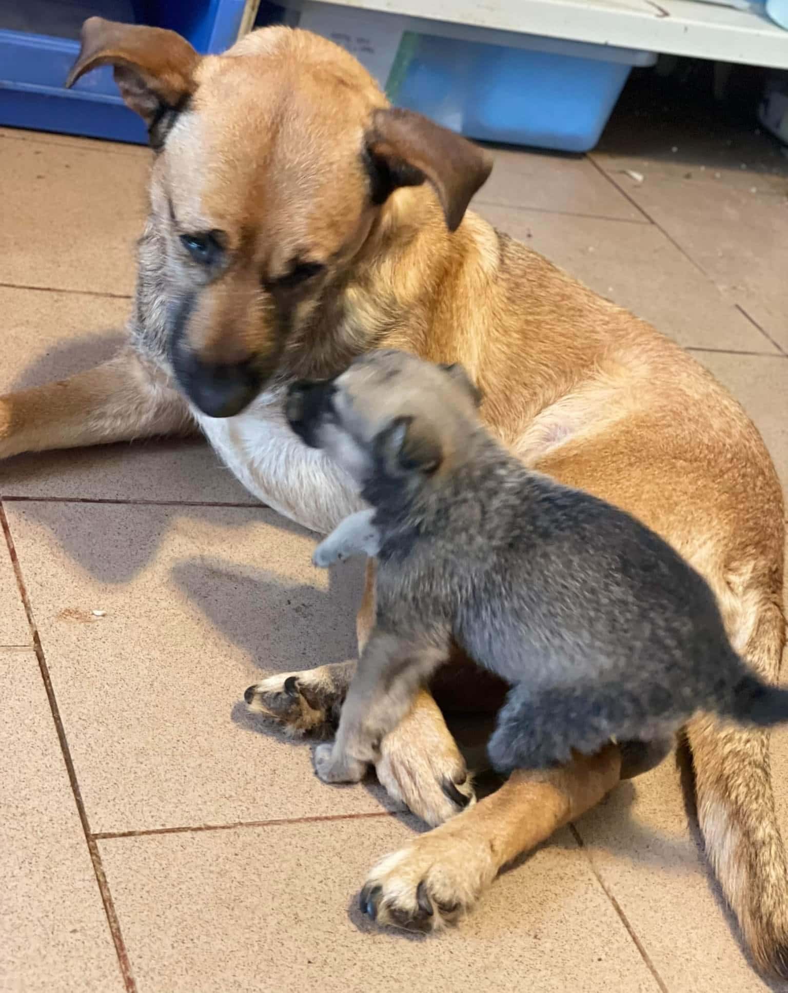 Die liebe Hündin springt gerne als Babysitter für die kleinen Welpen ein, aber es sind nicht ihre eigenen.