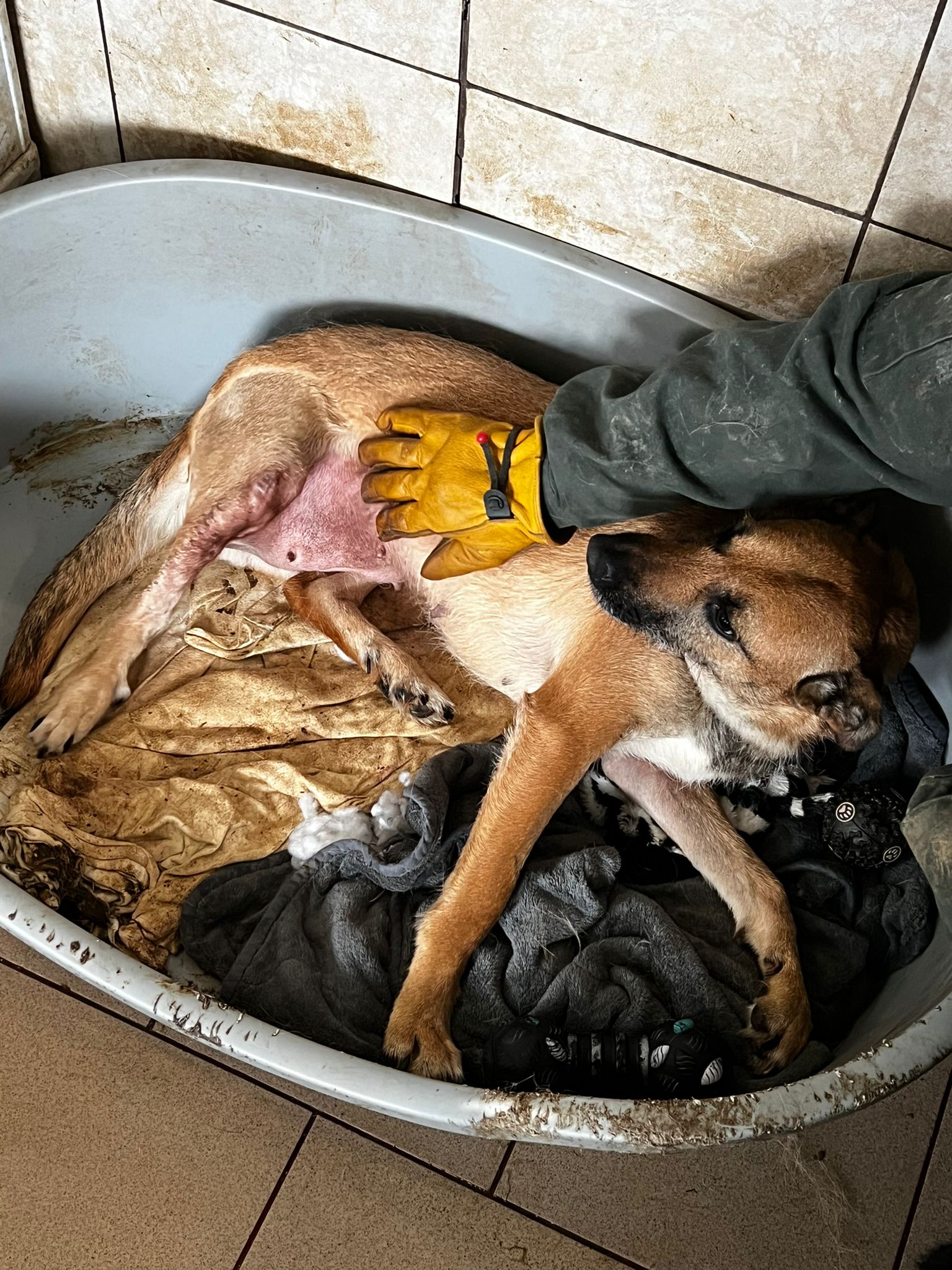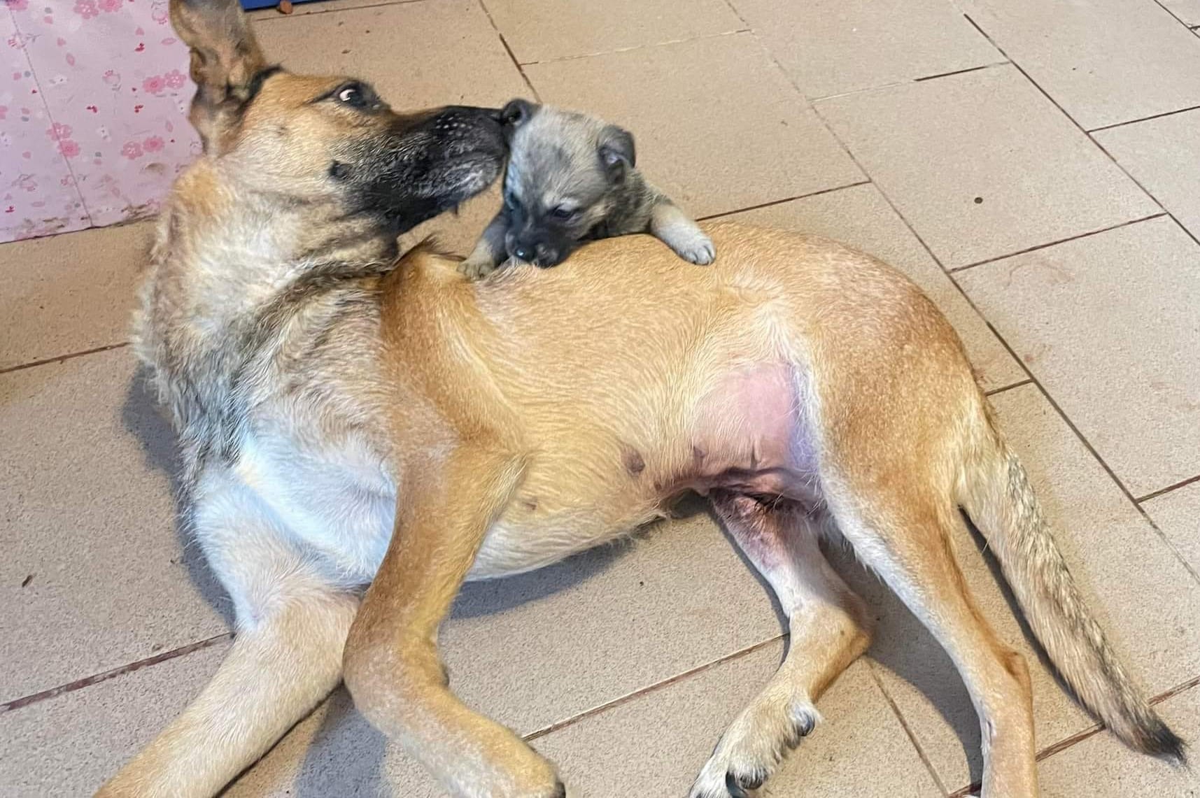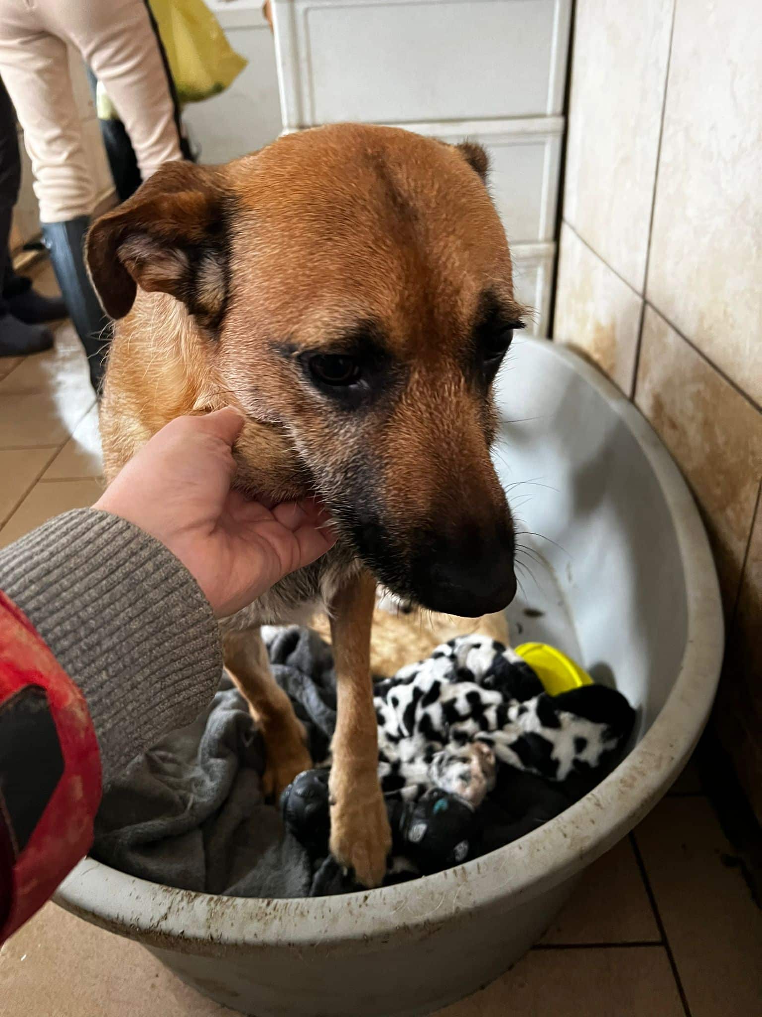 Hatte einen Autounfall, benötigt Physio, sollte zeitnah reisen. Die liebe Hündin kümmert sich rührend um die Welpen.