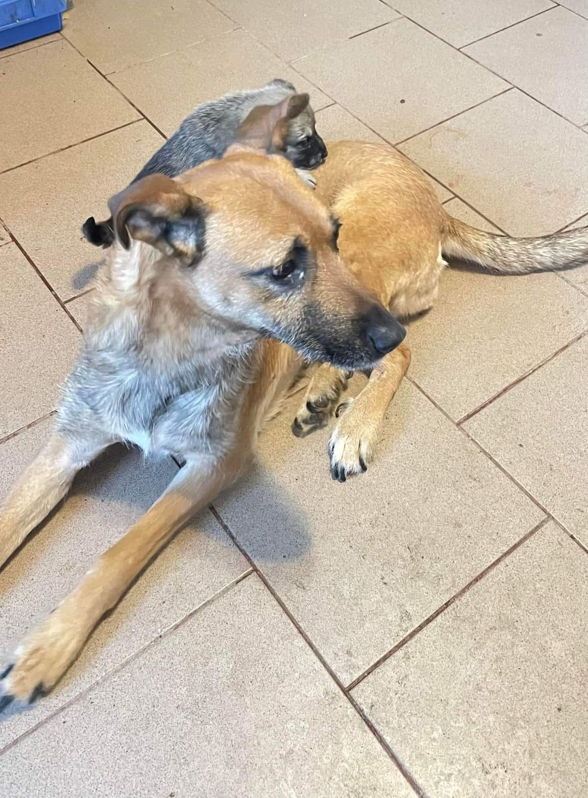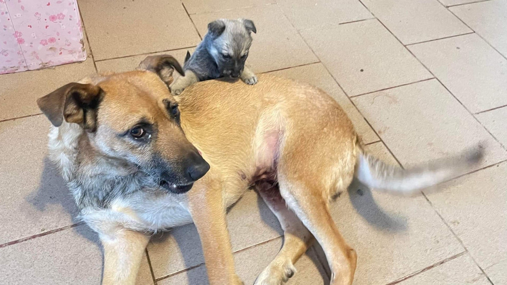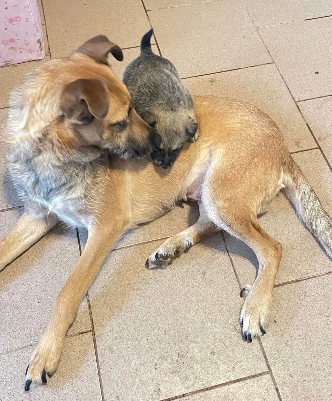 Hatte einen Autounfall, benötigt Physio, sollte zeitnah reisen. Die liebe Hündin kümmert sich rührend um die Welpen.