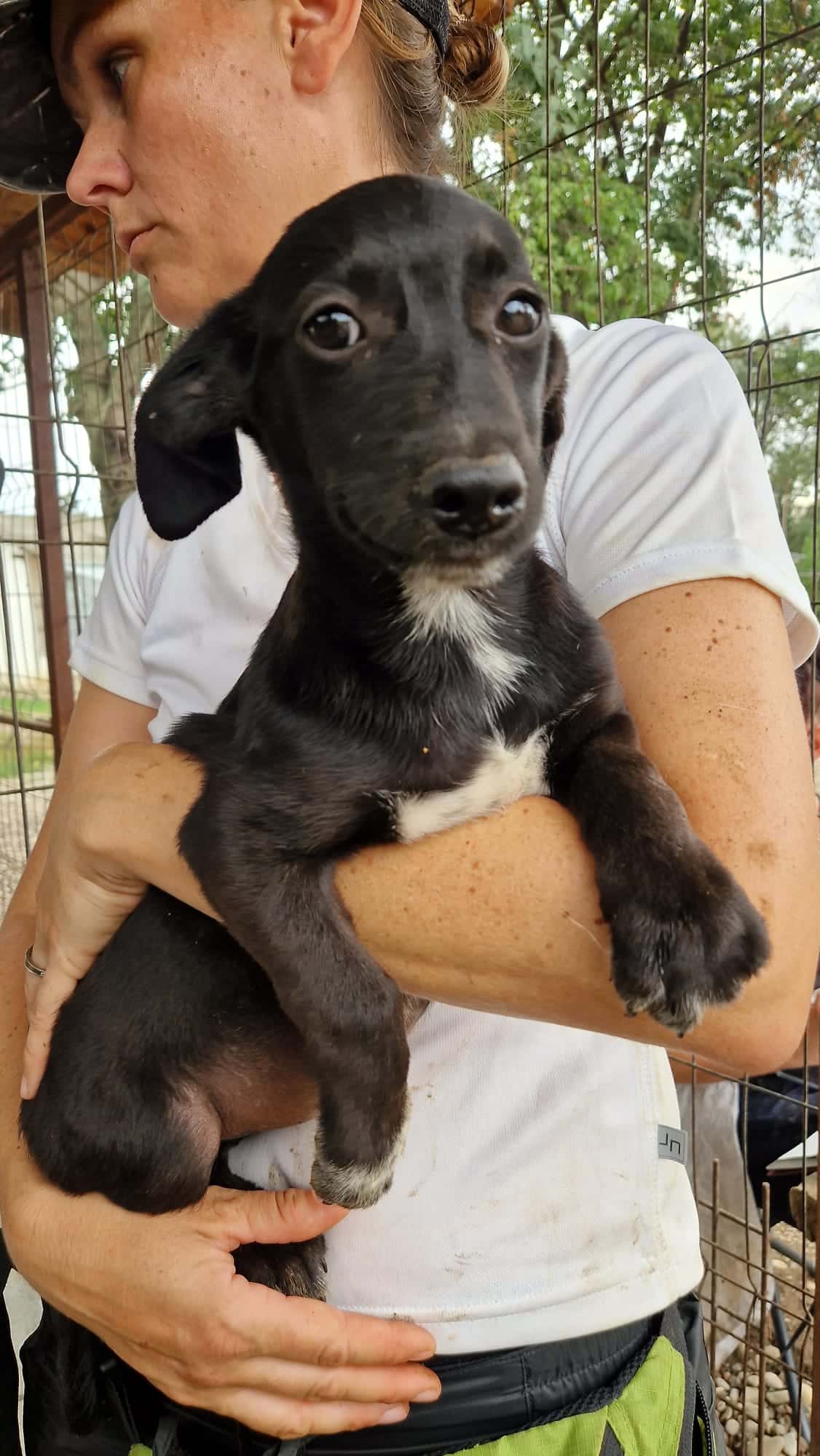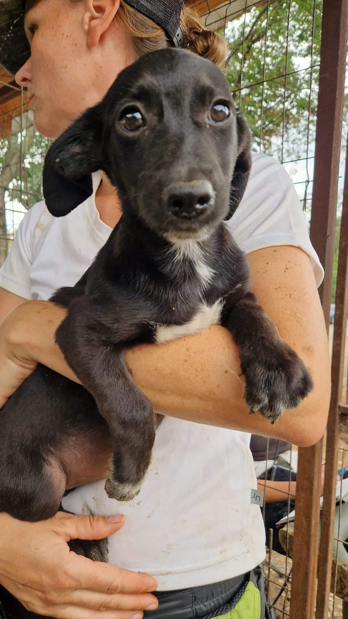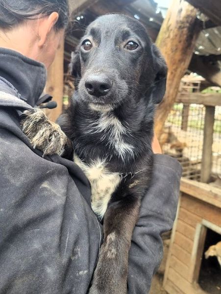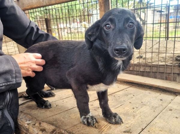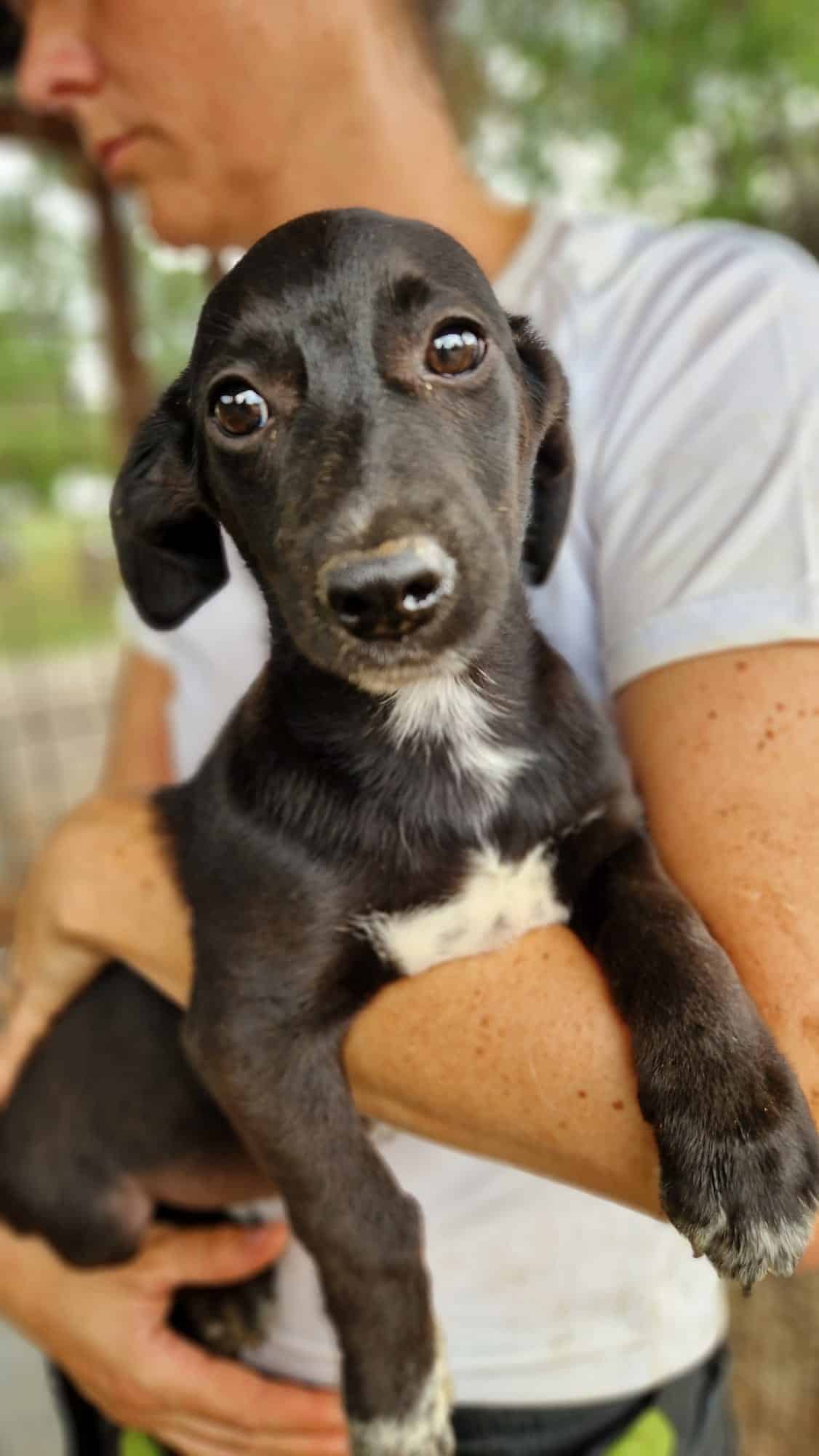 Der hübsche NOROC sieht aus wie ein Dackel in schwarzer Lederjacke, mit weißer Brust. Also ein richtig cooles Kerlchen. Leider sitzt er in einem winzigen Zwinger mit seinen Geschwistern und anderen Junghunden. Einige von seinen Mitbewohnern dürfen jetzt nach und nach ausreisen und das ist für NOROC überhaupt nicht cool. Als uns die Meute durch das Gitter sah, sprang auch er aufgeregt und neugierig am Zaun hoch. Wir waren extra nur zu zweit im Zwinger, weil sonst wirklich kaum Platz vorhanden ist. Dort wirkten wir für den Klein bleibenden, ca. 6 Monate jungen Rüden wahrscheinlich wie Riesen und er zog sich zurück. Auf unserem Arm blieb er ruhig und war überall anfassbar. Norman braucht zeitnah und regelmäßig, menschliche Zuwendung um nicht noch unsicher zu werden. Hoffentlich darf er es seinen Geschwistern bald nachmachen und in die Freiheit reisen.