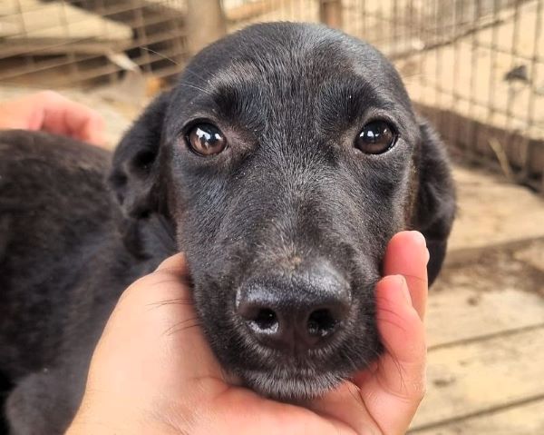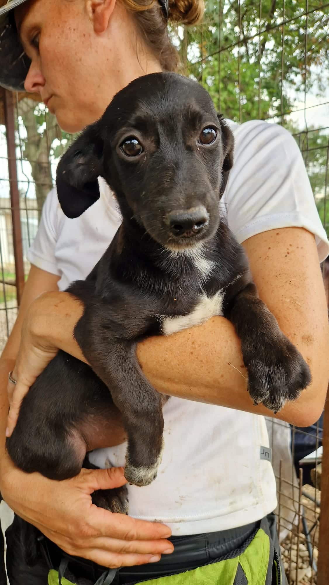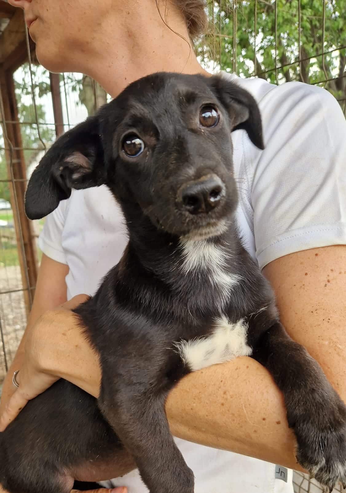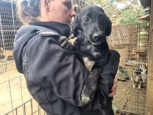 Der hübsche NOROC sieht aus wie ein Dackel in schwarzer Lederjacke, mit weißer Brust. Also ein richtig cooles Kerlchen. Leider sitzt er in einem winzigen Zwinger mit seinen Geschwistern und anderen Junghunden. Einige von seinen Mitbewohnern dürfen jetzt nach und nach ausreisen und das ist für NOROC überhaupt nicht cool. Als uns die Meute durch das Gitter sah, sprang auch er aufgeregt und neugierig am Zaun hoch. Wir waren extra nur zu zweit im Zwinger, weil sonst wirklich kaum Platz vorhanden ist. Dort wirkten wir für den Klein bleibenden, ca. 6 Monate jungen Rüden wahrscheinlich wie Riesen und er zog sich zurück. Auf unserem Arm blieb er ruhig und war überall anfassbar. Norman braucht zeitnah und regelmäßig, menschliche Zuwendung um nicht noch unsicher zu werden. Hoffentlich darf er es seinen Geschwistern bald nachmachen und in die Freiheit reisen.