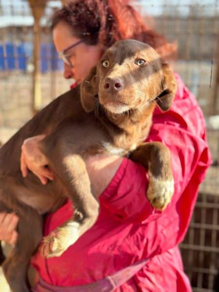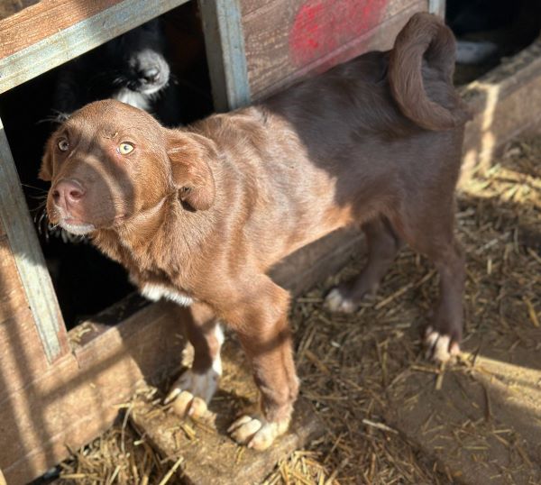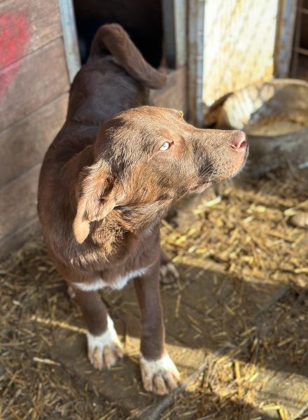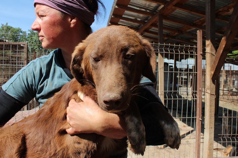 Den bildschönen Rüden Noshi mit der Kringelrute und den weißen Vorderpfoten lernten wir bei unserem Besuch in dem Tierheim Bucov/Rumänien als sehr sympathischen Bub kennen. Noshi zeigte sich etwas zurückhaltend, war aber immer mit dabei und suchte Kontakt zu uns. Noshi hat leichte O-Beine und unsere mitgebrachten Leckerlies waren eine willkommene Abwechslung zu dem Faden Trockenfutter, dass er sonst bekommt. Als wir ihn auf den Arm hoben und uns mit ihm auf ein Hüttendach setzten, blieb er zufrieden liegen und genoss die Streicheleinheiten.