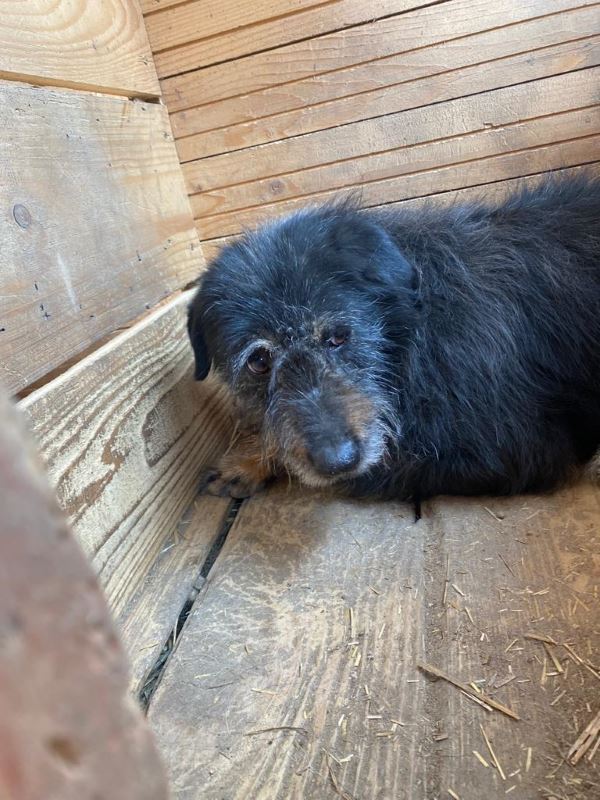 Nugget beobachtete uns interessiert, aber als wir uns ihm zuwandten, verkroch er sich in die Hütte, Hier konnten wir ihn – unter Bedrängung – gut anfassen. Er kennt es nicht und konnte es auch nicht genießen, aber hat er sich auch nicht gewehrt. Bei sehr erfahrenen Menschen mit einem souveränen Ersthund würde er nach längerer Eingewöhnungszeit sicherlich auftauen.