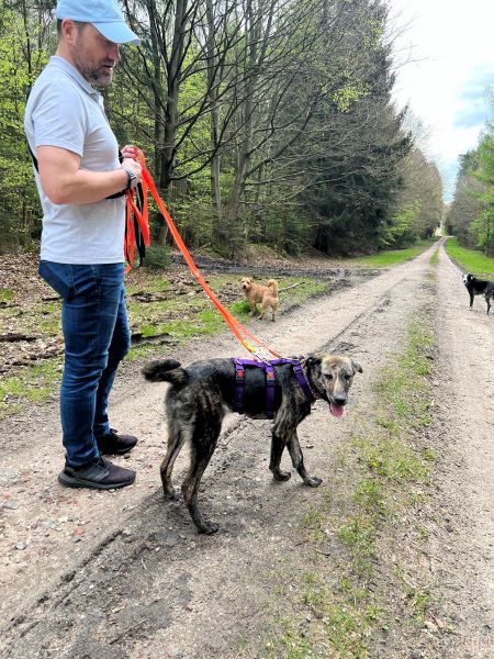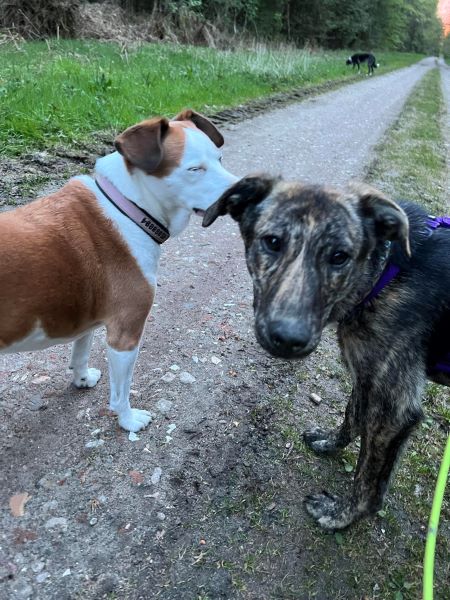 Konsequent sucht sie nach Konsequenz und ist dabei erwachsen und kindlich zugleich. Sie läuft schon ganz passabel an der Leine, wir trainieren… Bei Hundebegnungen zeigt sie sich devot und entspannt unaufgeregt. Autofahren in einer Box kann sie schon ganz prima. Mit unserem gemischten Rudel ist sie verträglich und bleibt auch schon eine angemessene Zeit allein. Ontari ist von Beginn an stubenrein.