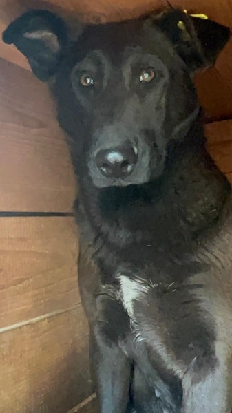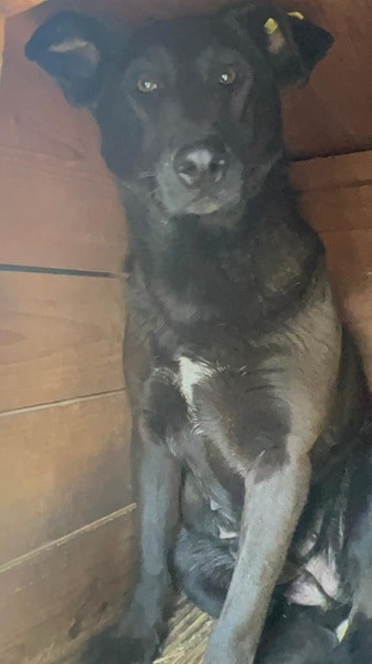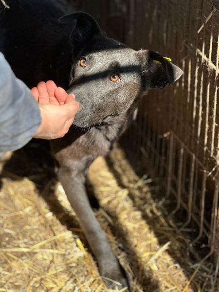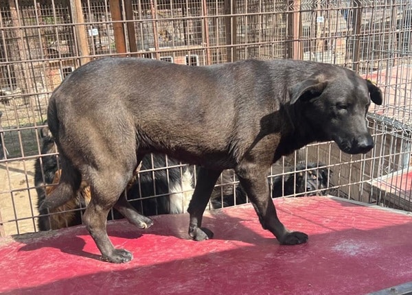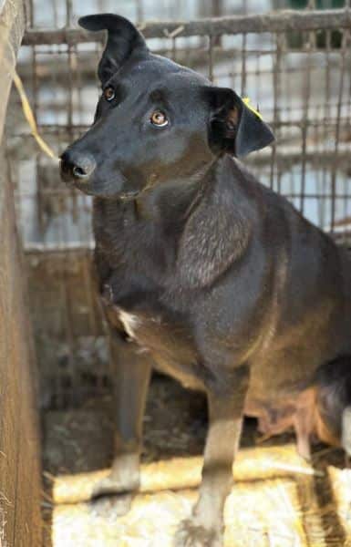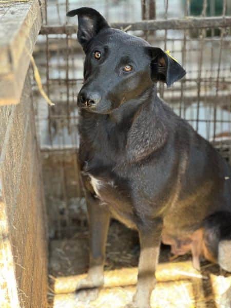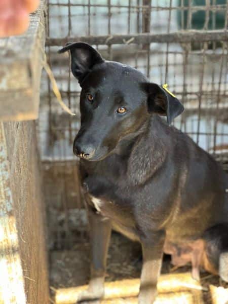 Eine ganz arme Hundemama. Ende März lebte nur noch einer ihrer Welpen und war ca. 2 Monate alt. Wir hoffen, er packt es. Sie war am Kennelgitter neugierig und hat uns Leckerchen aus den Fingern genommen. Im Kennel war sie dann doch wieder schüchterner. Roch zwar an den Fingern, aber war zu unsicher, um bereits im direkten Kontakt Leckerchen aus den Fingern zu nehmen. Mit ausreichend Hundeerfahrung wird man diese wunderschöne, schwarze Hündin für sich gewinnen können. Da sie alleine mit ihrem Welpen saß, können wir noch nichts zu ihrer Verträglichkeit sagen. Bei Interesse daher bitte nachfragen, sofern von Bedeutung.