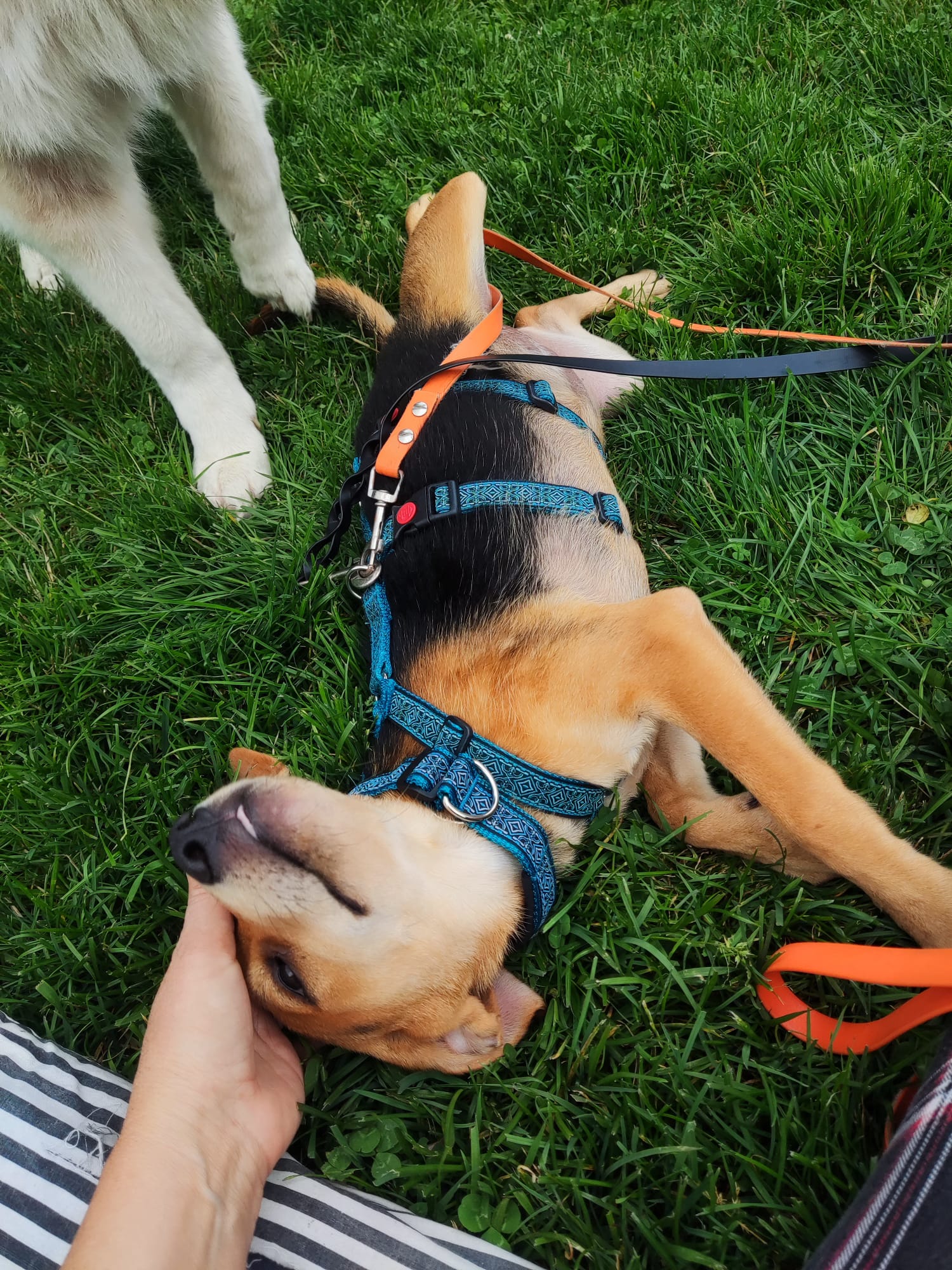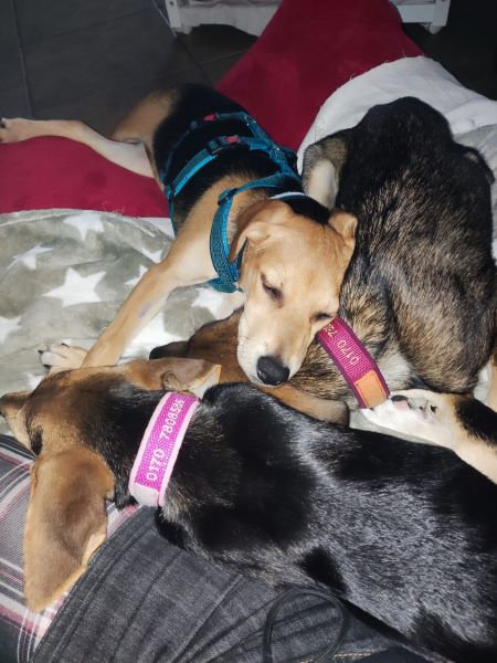 Sie hat sich ganz schnell hier in unsere Gruppe eingefügt. Sie mag Artgenossen, sie mag Menschen und die Katzen auf PS im Haus sind auch okay. Draußen allerdings mag sie ihnen noch hinterherlaufen…wir arbeiten dran.