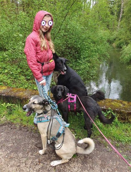 Sie geht gerne Gassi, auch längere Runden bereiten ihr große Freude. Sie läuft schon gut an der Leine und ist draußen sehr entspannt und nicht schreckhaft. Hundebegegnungen sind für sie kein Problem, sie ist dabei eher zurückhaltend, aber freundlich. Auf Baumstämme klettern oder kleine Hindernisse überwinden meistert sie mit Bravour. Sie hat schon mehrere Social Walks mit vielen fremden Hunden ganz cool absolviert.