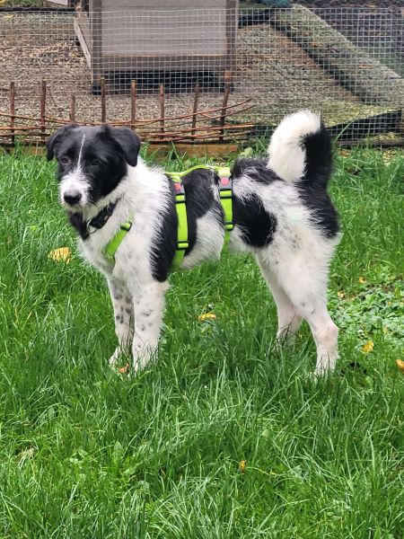 Er läuft draussen gut an der Leine. Leinenführigkeit muss jedoch noch geübt werden.