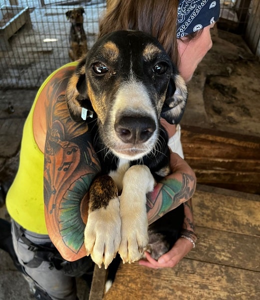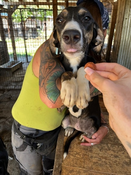PETTY hatte bei unserem Besuch leider eine dicke Backe, wahrscheinlich eine Bissverletzung. Sie war wieder neugierig und nahm gerne unsere Leckerlies aus der Hand. Bei Berührungsversuchen weicht sie zurück und wir konnten sie nur vorsichtig berühren – den Fluchtweg haben wir ihr diesmal nicht versperren können. PETTY geht in ihrem Kennel zwischen aktiveren und zutraulicheren Hunden etwas unter.