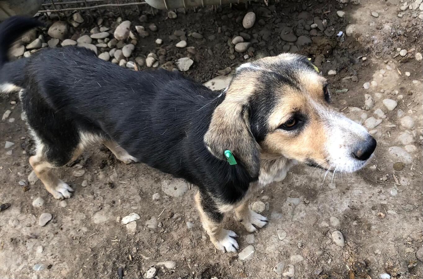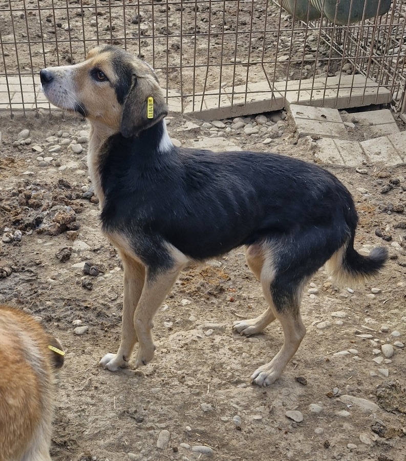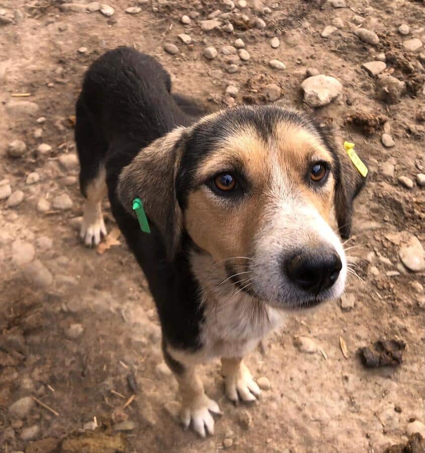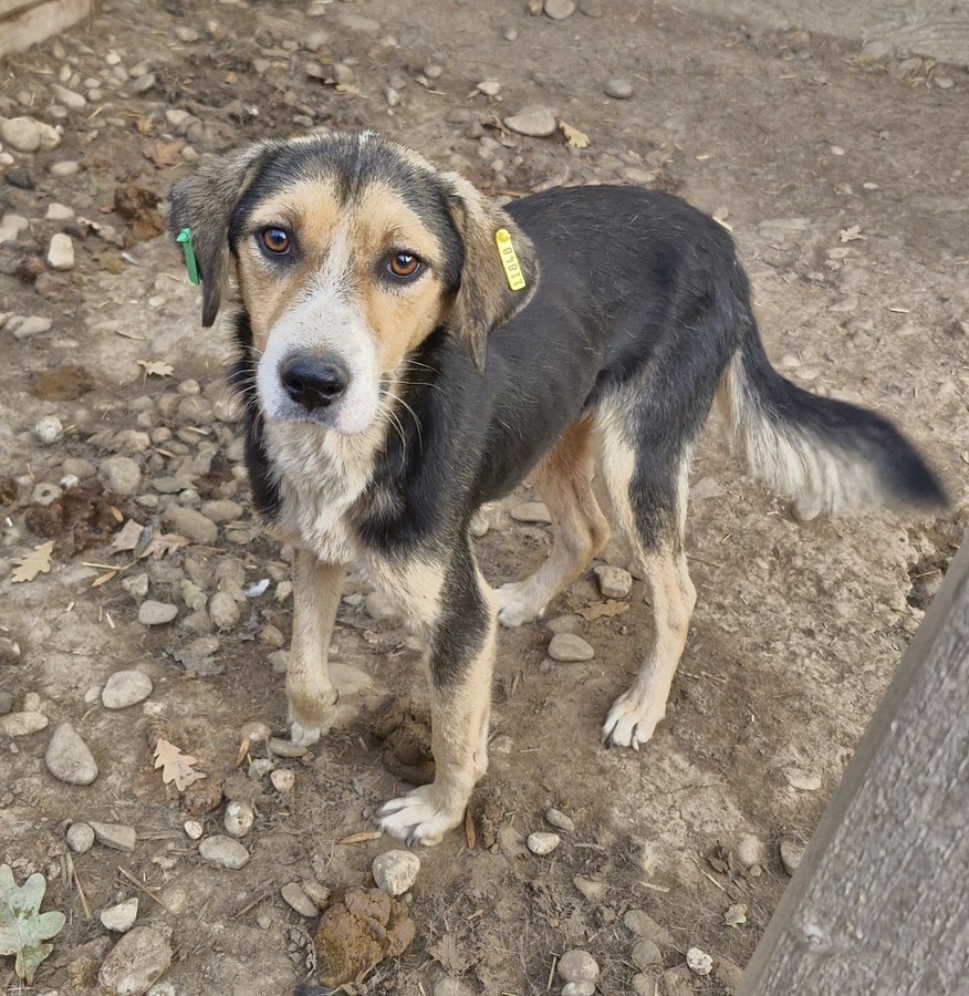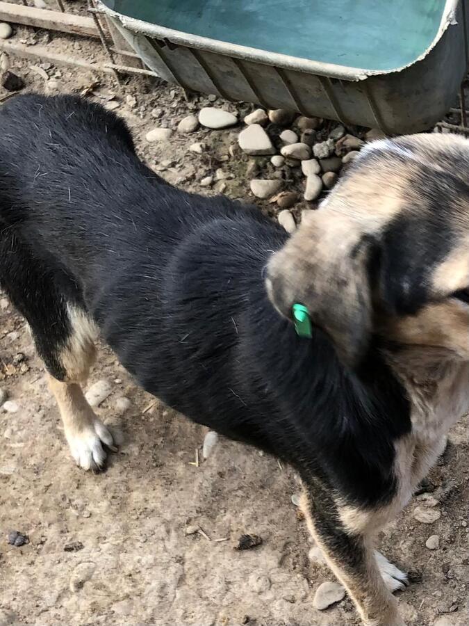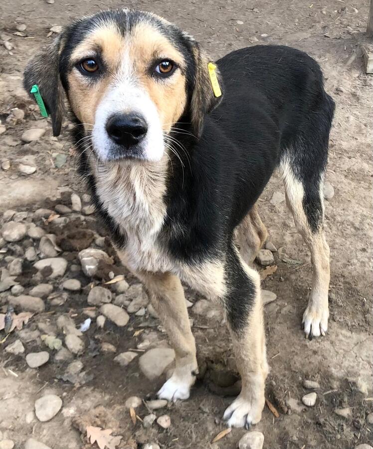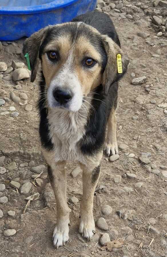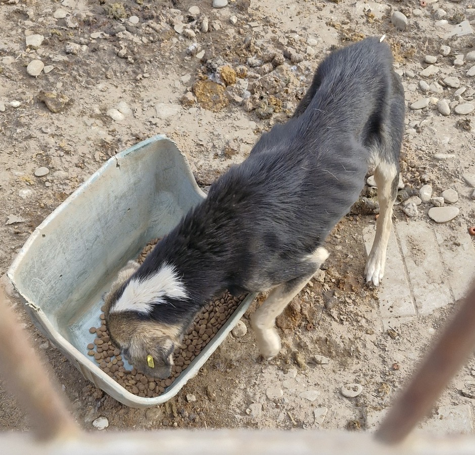 Als wir den Kennel betraten kam dieser nette, bunte Rüde Phips vorsichtig aus der Hütte. Wir waren doch erschrocken als wir ihn in diesem Zustand vorfanden. Total abgemagert wie er war wedelte er mit der Rute und kam schnellstens zu uns und suchte Schutz, da ein dominanter Rüde ihn attackieren wollte. In unserem Schutz verschlang Phips das ihm angebotene Futter im nu und wich uns nicht mehr von der Seite. Auf uns machte er einen sehr zutraulichen Eindruck und ließ sich sehr gerne streicheln. Er lebt aktuell mit großen Rüden und Hündinnen zusammen und hält sich eher im Hintergrund auf.