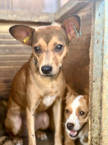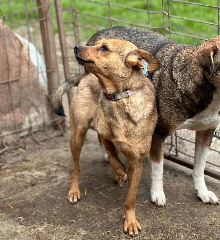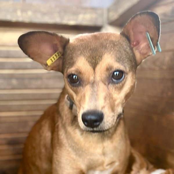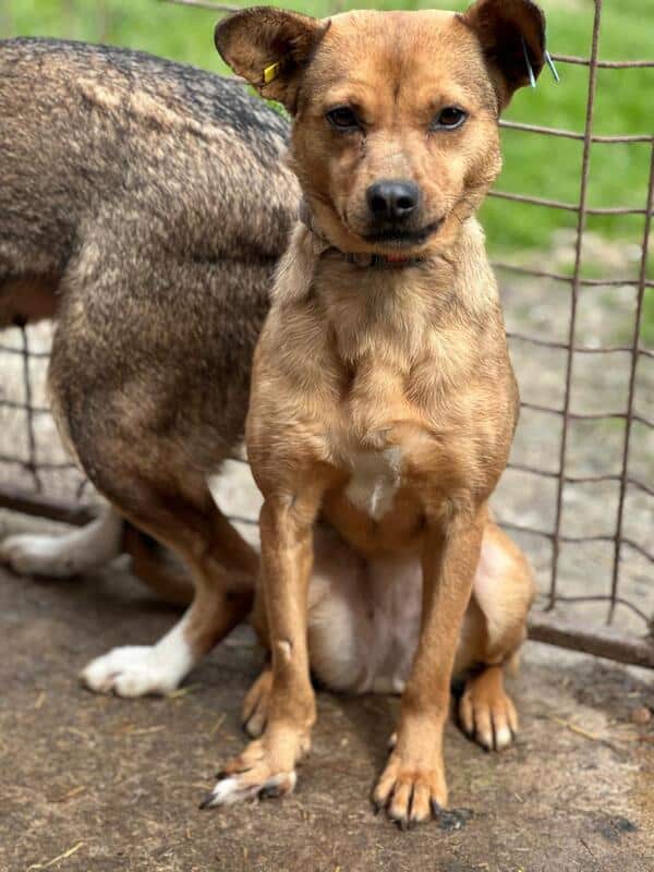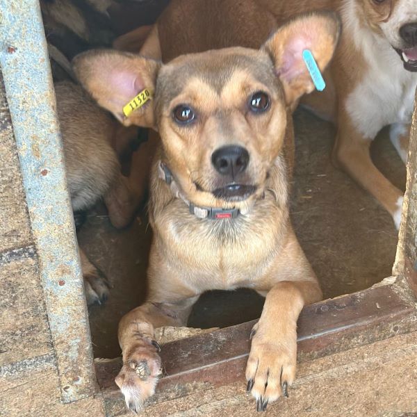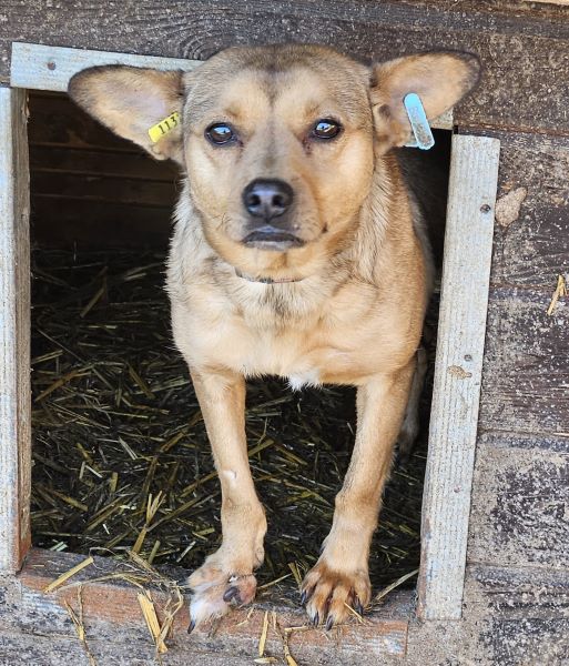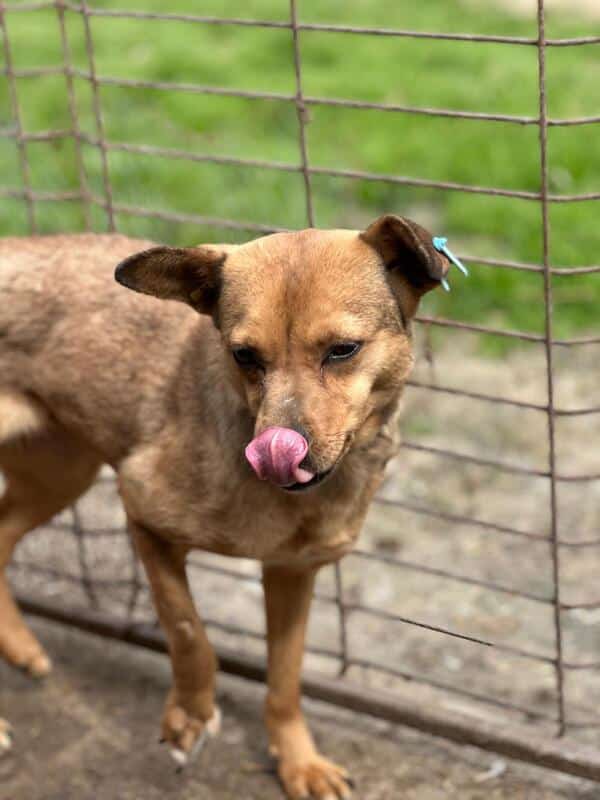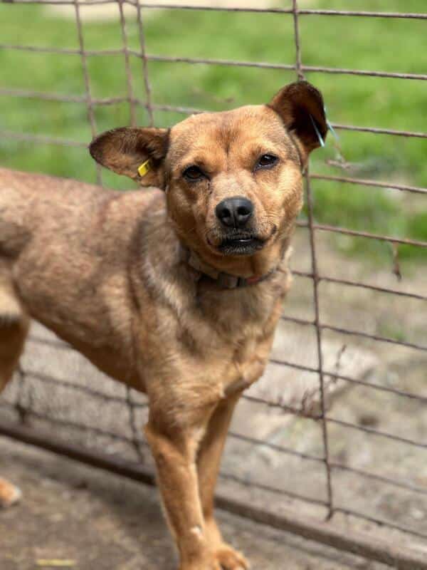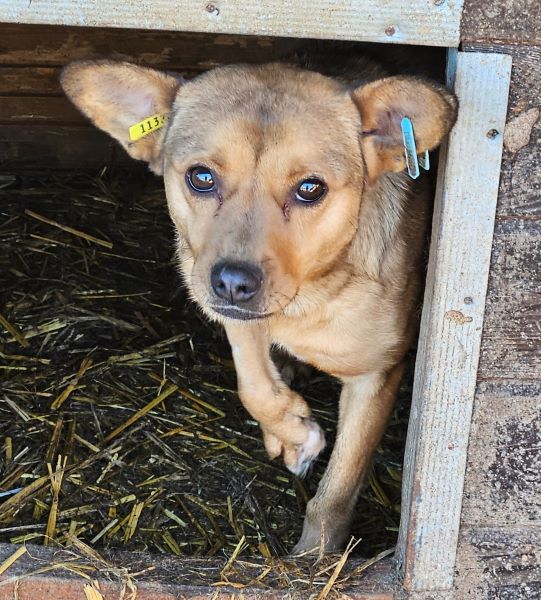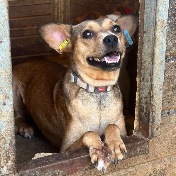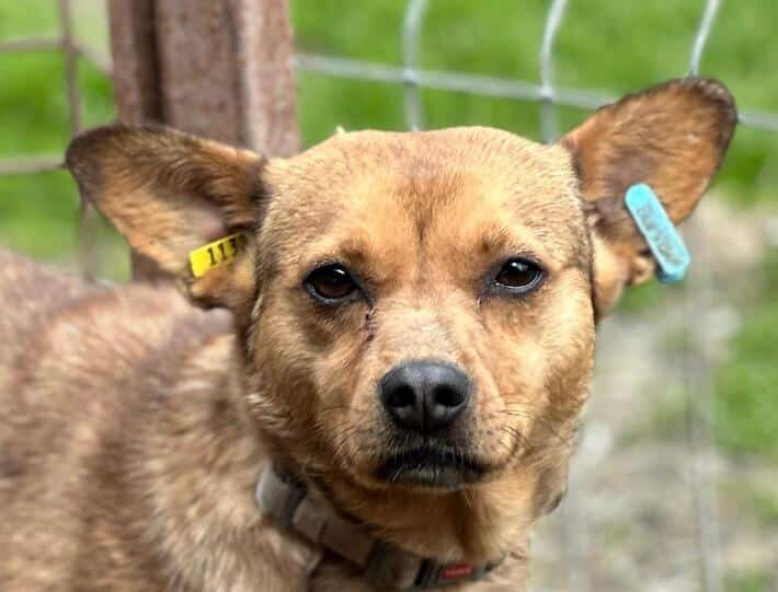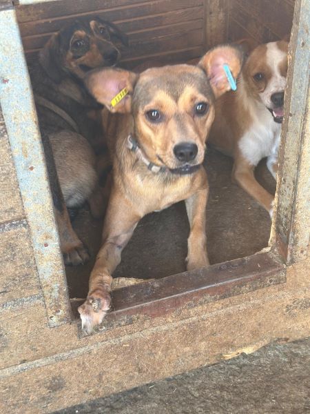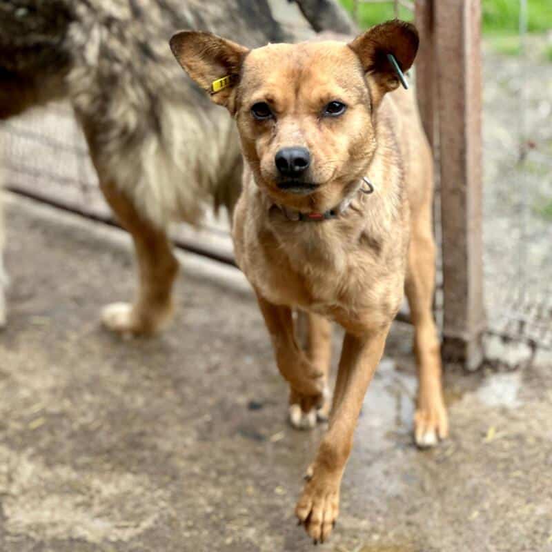 Diese süße Hündin mit den witzigen Ohren hatte mal Besitzer. Dies ist gut am Halsband erkennbar. Sie wird noch nicht lange im Shelter sein und ihre Vorderpfote Verletzung ebenso.